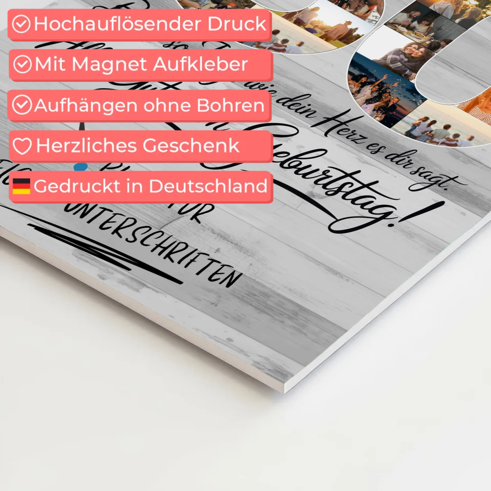 Suchst du nach einer einzigartigen Geschenkidee für den 30. Geburtstag deiner Schwester? Dann ist unser Magnet Wandbild mit Unterschriften Schwester 30 Geburtstag genau das Richtige für dich! Dieses personalisierte Wandbild bietet dir die Möglichkeit, über 20+ Fotos einzufügen und mit einem eigenen Spruch oder Wunschtext zu versehen. So wird das Geschenk nicht nur individuell, sondern auch unvergesslich!