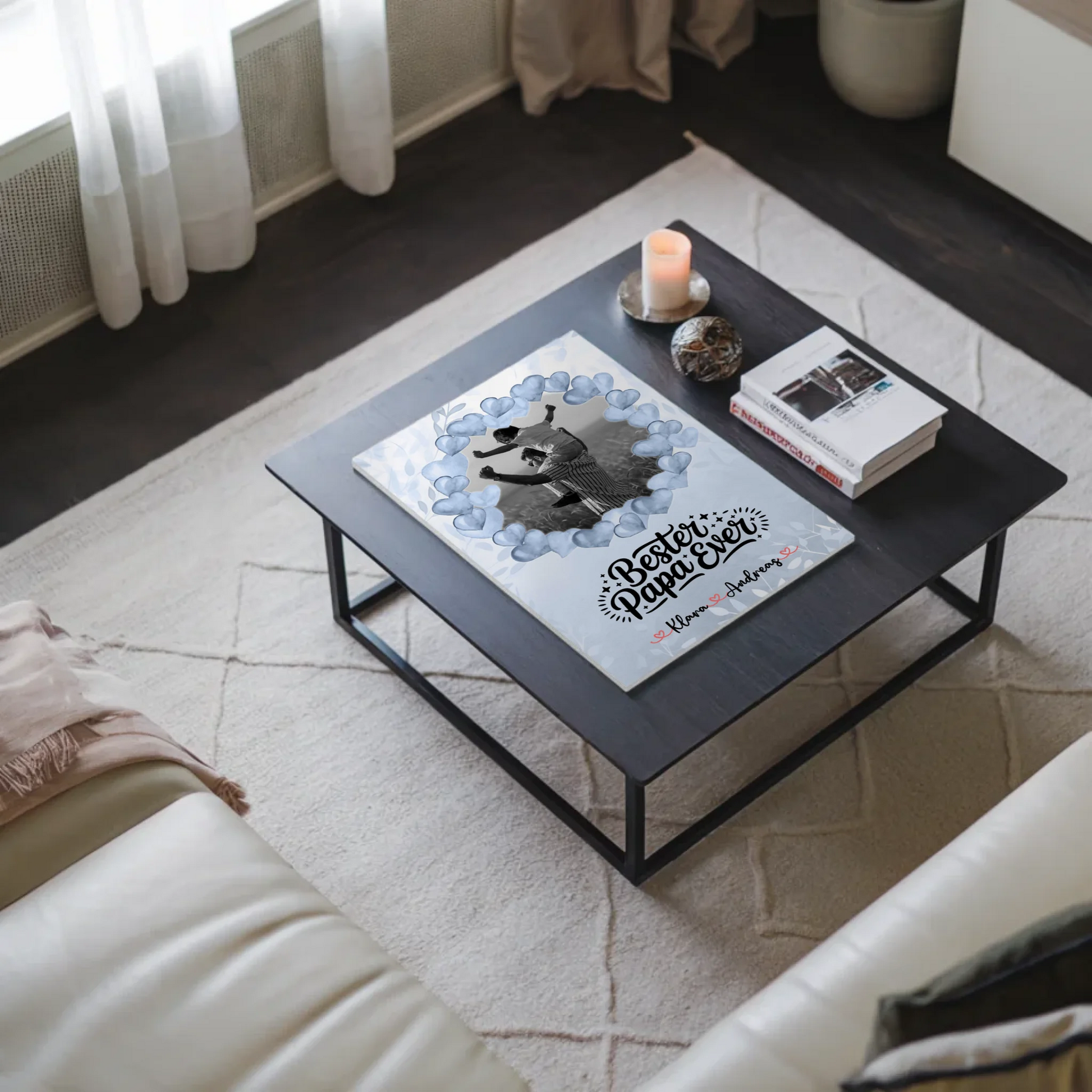 Perfekt geeignet als persönliches Vatertag Geschenk für Papa, das Erinnerungen sicht- und greifbar macht. Bestimme Foto, Namen und den Spruch und gestalte ein Unikat voller Herz.