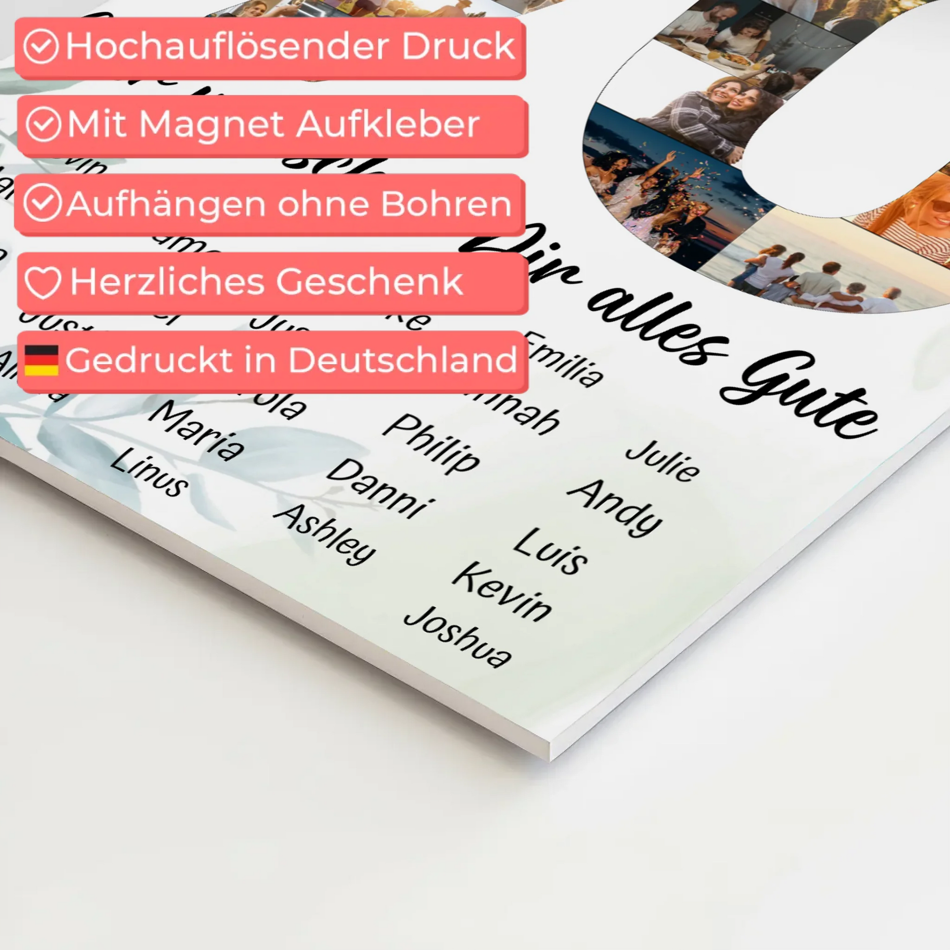 Bei unserem Magnetischen Fotoboard hast du die Möglichkeit, mehr als 20 Fotos auszuwählen und hinzuzufügen. Gestalte das Board ganz nach deinen Wünschen: Füge einen eigenen Spruch oder Wunschtext hinzu und lass wichtige Namen oder Unterschriften der Liebsten einfließen. Optional kannst du zudem ein passendes Hintergrundbild auswählen, das perfekt zur Persönlichkeit der Jubilarin passt.