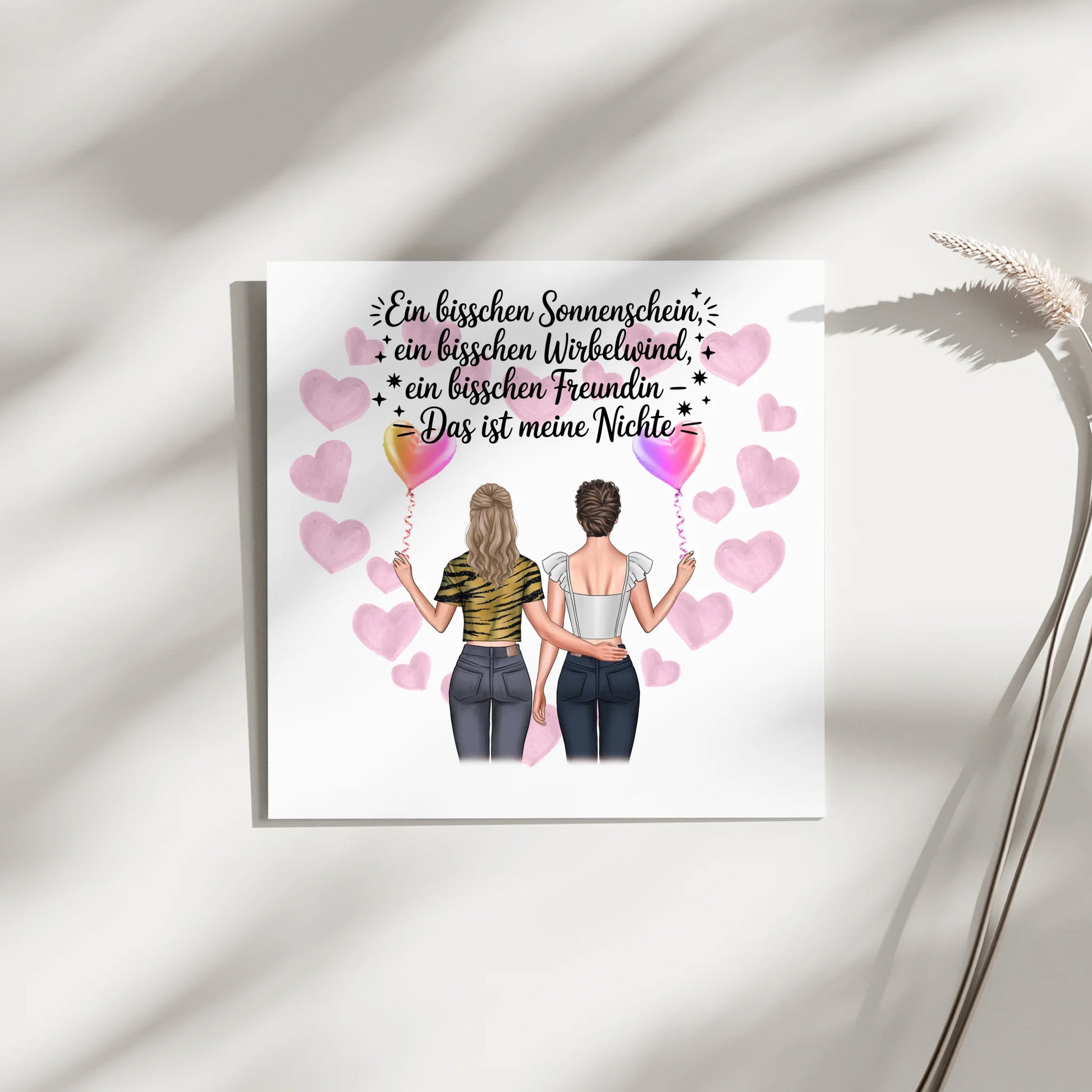 Gestalte ein persönliches magnetisches Fotoboard Wandbild für deine Nichte und überrasche sie zu jedem Anlass. Das hochwertige Wandbild verbindet Dekoration und Erinnerung und lässt sich ganz nach deinen Wünschen anpassen: 2 Clipart Frauen, Namen, Hintergrundbild und ein eigener Spruch oder Wunschtext. Auf dem Design steht der schöne Spruch Ein bisschen Sonnenschein ein bisschen Wirbelwind ein bisschen Freundin - das ist meine NICHTE, den du übernehmen oder beliebig ändern kannst.