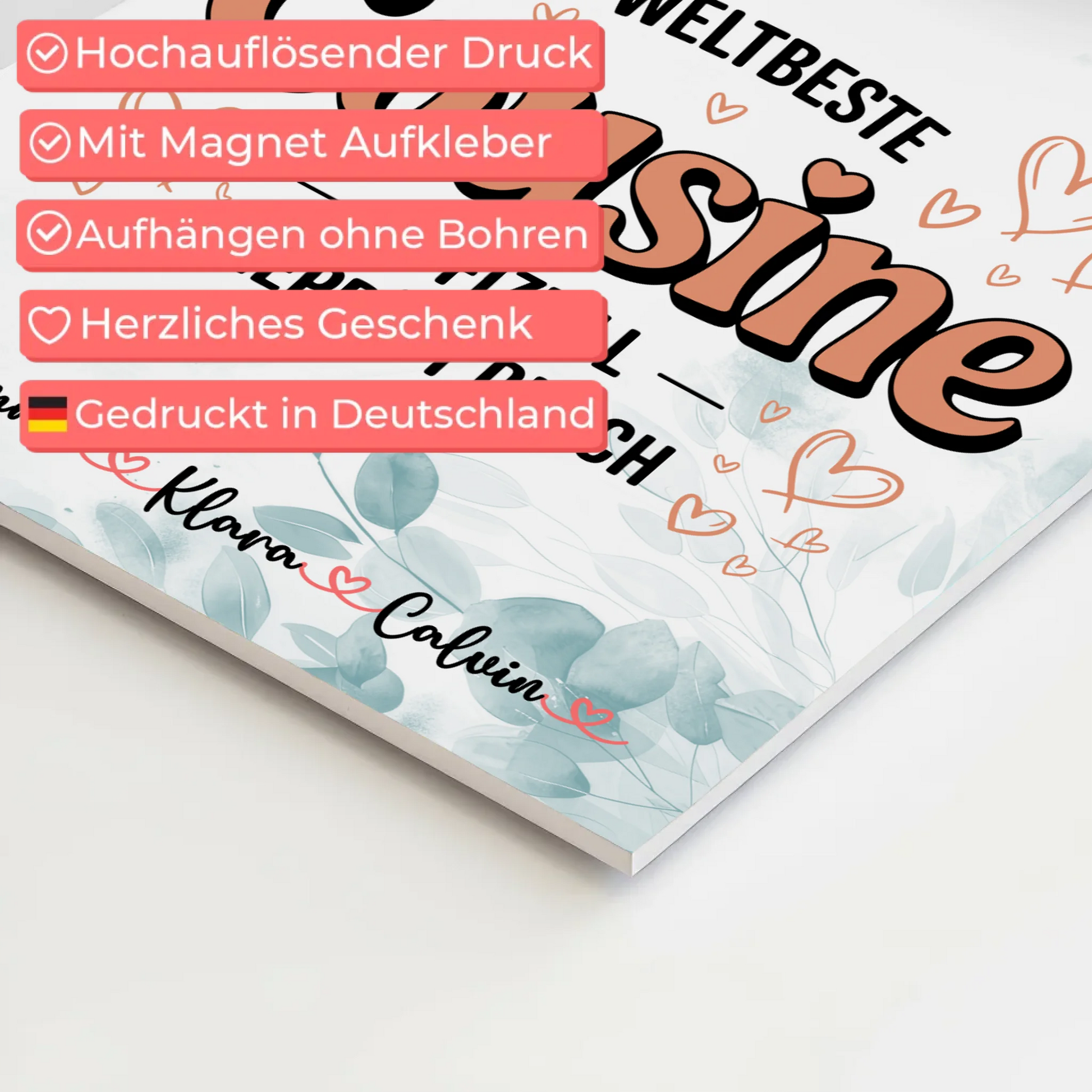 Suchst du nach einem einzigartigen und persönlichen Geschenk für deine Cousine? Das Magnetposter Fotoboard Fotocollage Cousine Weltbeste Cousine Offiziell Geprüft Durch ist die ideale Wahl! Dieses individuell gestaltbare Fotocollage für Cousine kannst du ganz nach deinem Geschmack anpassen. Du hast die Möglichkeit, 3 Fotos, Namen und ein Hintergrundbild zu personalisieren, um deiner Cousine eine besondere Freude zu bereiten. Das Design ist vielseitig: Du kannst den Hintergrund weiß lassen oder zwischen floralen Mustern, Wasserfarb-Style, Holz-Optik oder Mustern wie Sterne oder Blüten wählen. Die Fotos kannst du farbig belassen oder mit einem Schwarz-Weiß-Filter versehen, um den perfekten Look zu erzielen. Das Design ist mit dem schönen Spruch „Weltbeste Cousine Offiziell Geprüft Durch versehen, der deine Wertschätzung auf besondere Weise ausdrückt. Dieses personalisierte Magnetposter ist ein tolles Fotocollage für Cousine, das sich perfekt für jeden Anlass eignet. Ob Geburtstag, Weihnachten, Jubiläum oder einfach nur so - dieses Geschenk zaubert deiner Cousine garantiert ein Lächeln ins Gesicht. Überrasche sie mit einem einzigartigen, individuell gestalteten Poster, das ihre Bedeutung in deinem Leben widerspiegelt. Das Magnetposter Fotoboard Fotocollage Cousine Weltbeste Cousine Offiziell Geprüft Durch ist die perfekte Wahl, um deiner Cousine zu zeigen, wie sehr du sie schätzt. Bestelle jetzt dein personalisiertes Geschenk und mache jeden Anlass unvergesslich!