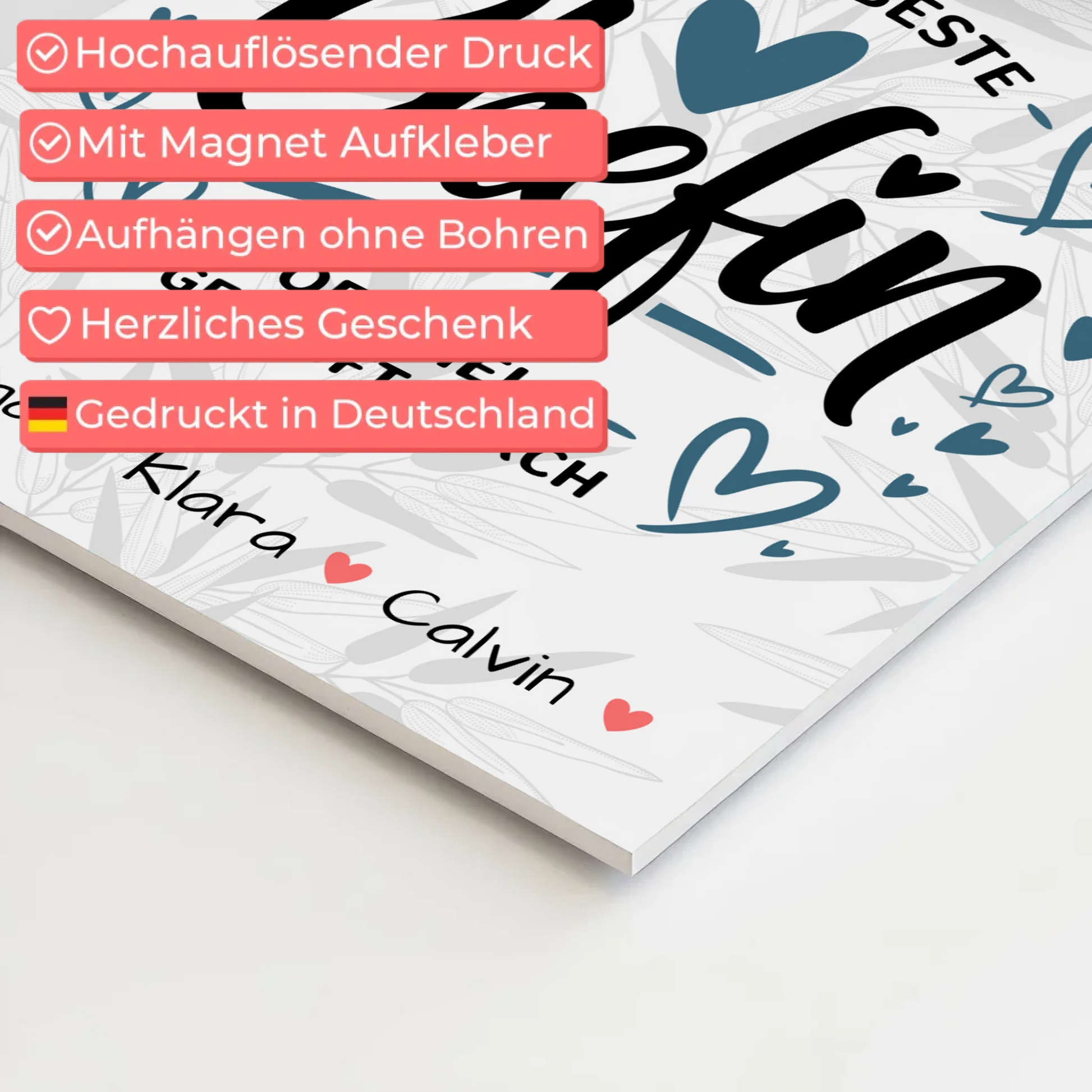 Gestalte dein Magnetposter ganz nach deinen Wünschen: Lade bis zu 3 persönliche Fotos hoch, wähle die Namen der Gratulanten und entscheide dich für ein passendes Hintergrundbild. Ob klassisch weiß, floraler Stil, moderner Wasserfarben-Look, rustikaler Holz-Style oder ein Muster mit Sternen oder Blüten - hier findest du das perfekte Design für deine Chefin. Die Fotos kannst du farbig lassen oder mit einem stilvollen Schwarz-Weiß-Filter versehen, um dem Geschenk eine besondere Note zu verleihen.