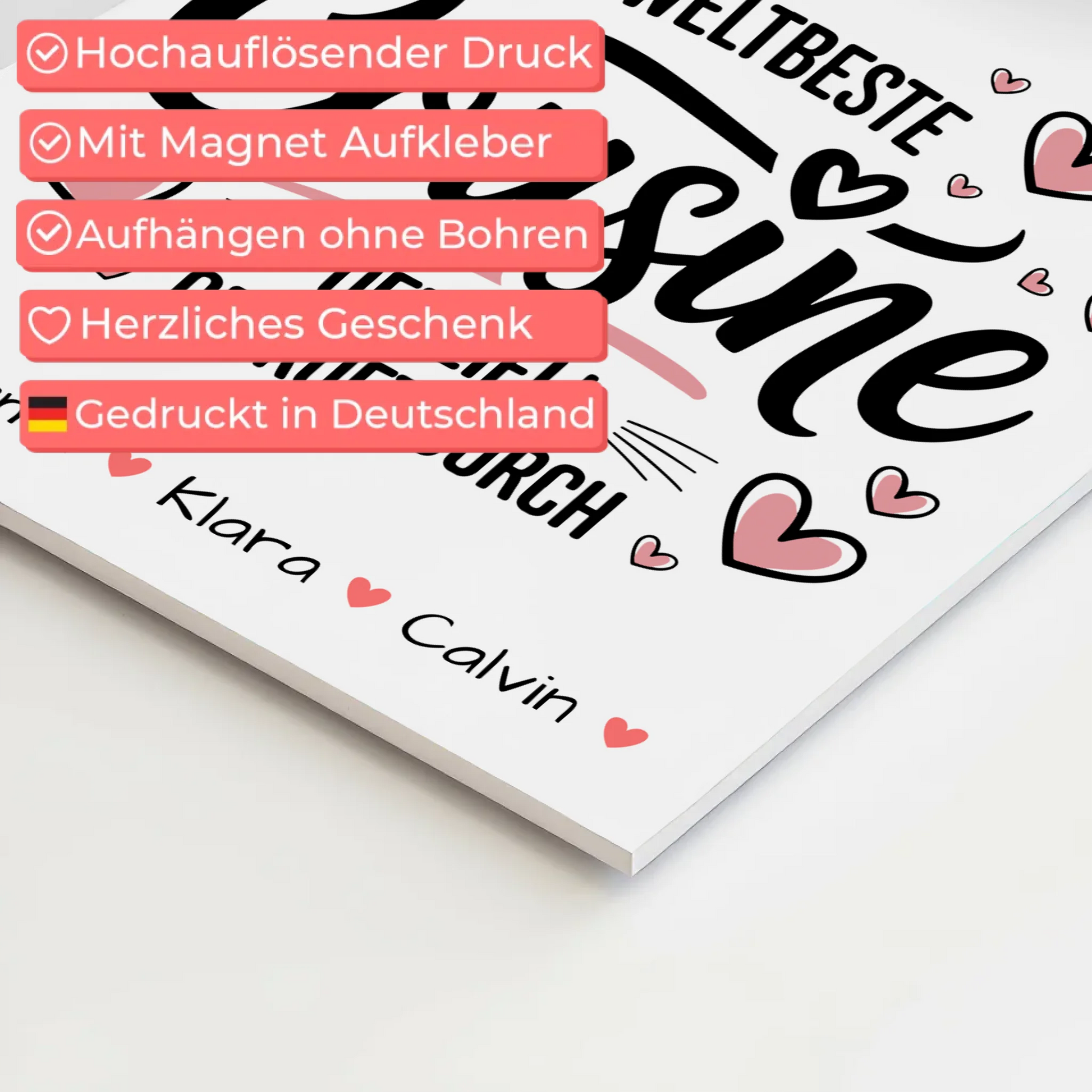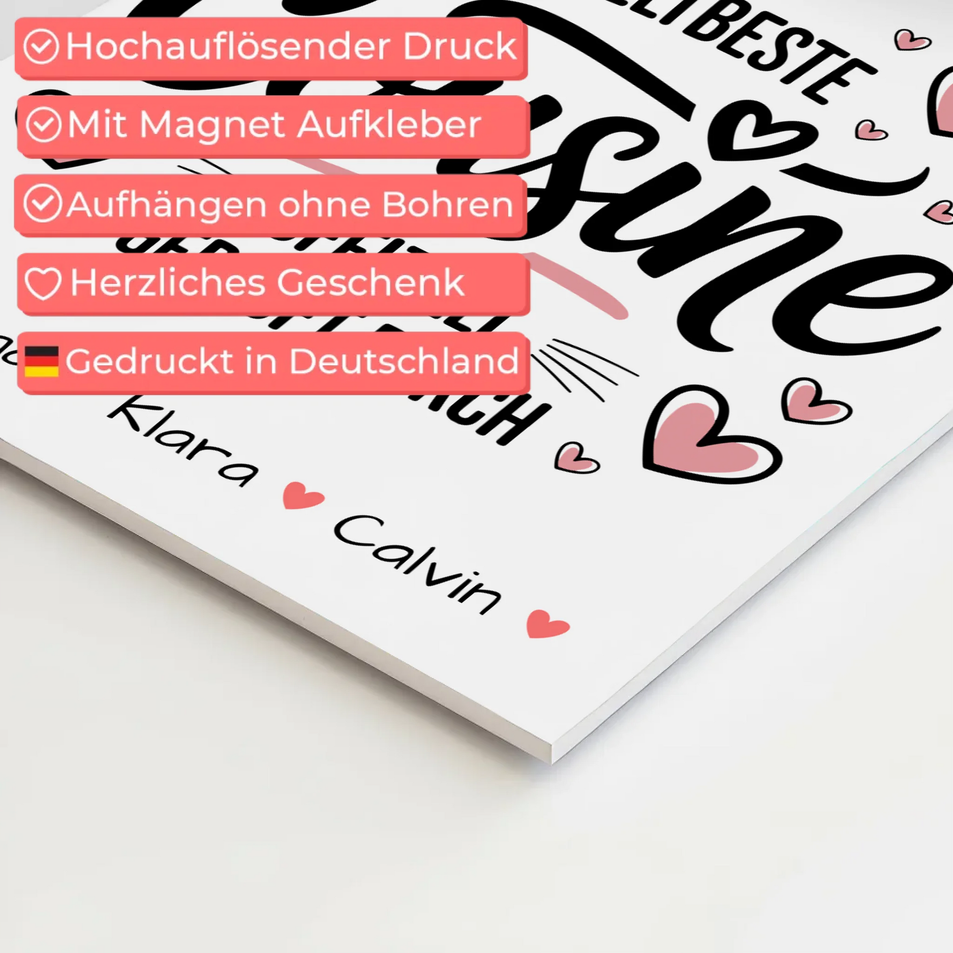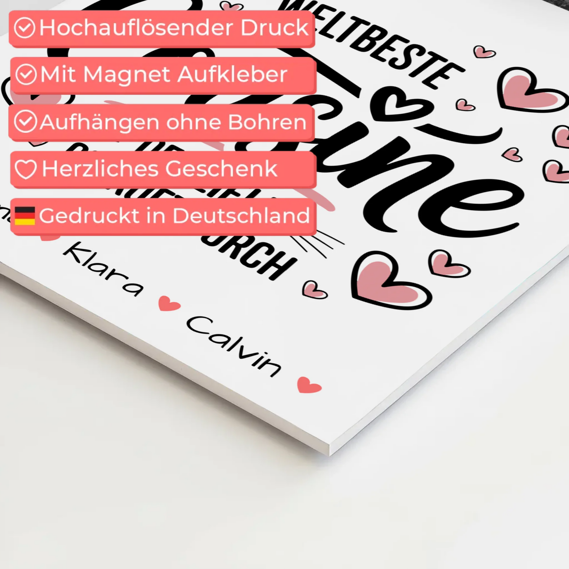 Entdecke das perfekte Geschenk für jeden Anlass mit unserem personalisierten Magnetposter Fotoboard Geschenk Fotocollage Cousine Weltbeste Cousine Offiziell Geprüft Durch. Dieses einzigartige Fotocollage für Cousine kannst du ganz individuell gestalten, indem du 3 Fotos, Namen und ein Hintergrundbild deiner Wahl hinzufügst. Das Design besticht durch eine stilvolle Fotocollage mit 3 Fotos, die du entweder farbig oder in Schwarz-Weiß-Optik wählen kannst. Der Hintergrund lässt sich flexibel anpassen: Entscheide dich für einen schlichten weißen Hintergrund, einen floralen Stil, Wasserfarben-Design, Holz-Optik oder ein Muster wie Sterne oder Blüten. Das Design ist mit dem liebevollen Spruch Weltbeste Cousine Offiziell Geprüft Durch versehen, der deine Wertschätzung perfekt zum Ausdruck bringt. Dieses personalisierte Geschenk ist ideal für die Cousine, egal ob zu Geburtstag, Weihnachten, Jubiläum oder einfach als kleine Aufmerksamkeit. Überrasche deine Cousine mit diesem einzigartigen Fotocollage für Cousine, das garantiert für Freude sorgt und unvergessliche Momente schafft. Mache dein Geschenk noch persönlicher und zeige deiner Cousine, wie sehr du sie schätzt - mit diesem individuell gestalteten Magnetposter Fotoboard Geschenk Fotocollage Cousine Weltbeste Cousine Offiziell Geprüft Durch.