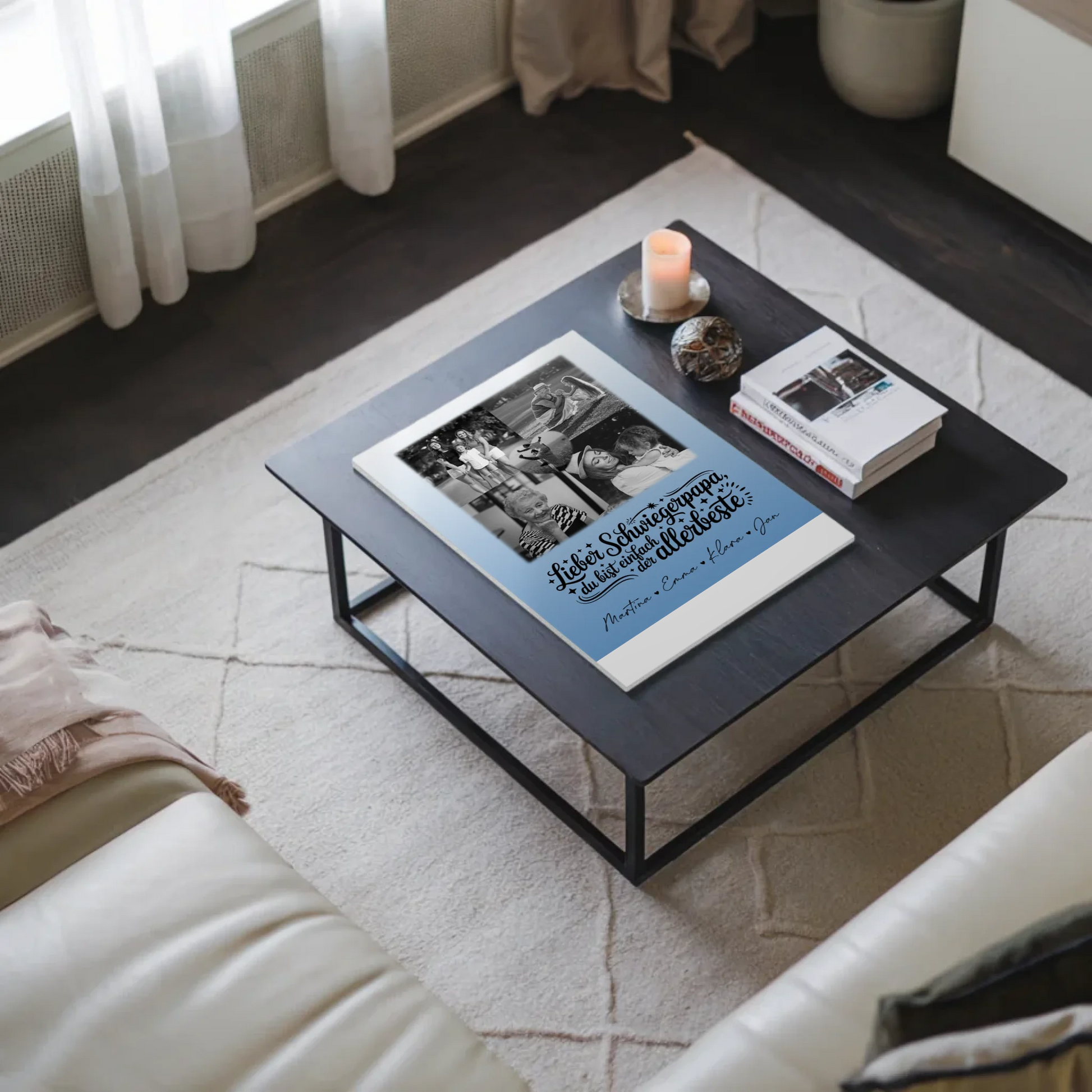 Überrasche deinen Schwiegerpapa mit dem einzigartigen Magnetposter Fotoboard mit 4 Fotos und 1 Herz Foto Alles Gute und Gesundheit Papa Schwarz-Weiß. Dieses individuell gestaltbare Geschenk ist ideal, um deine schönsten Erinnerungen und liebevollen Wünsche auf eine besondere Art zu präsentieren. Du kannst bei diesem personalisierten Geschenk bis zu 5 Fotos, einen eigenen Spruch oder Wunschtext sowie die Namen hinzufügen, um es ganz persönlich zu machen. Das Design mit dem schönen Spruch „Lieber Schwiegerpapa, alles Gute und viel Gesundheit“ macht dieses Fotoboard zu einem emotionalen Highlight, das deinem Schwiegerpapa zum Geburtstag garantiert Freude bereitet. Das Magnetposter eignet sich perfekt als Fotocollage für Schwiegerpapa und ist eine liebevolle Geste, um Wertschätzung und Liebe zu zeigen. Das hochwertige Schwarz-Weiß-Design verleiht dem Geschenk eine elegante Note und macht es zu einem zeitlosen Erinnerungsstück. Überzeuge dich selbst von der Vielseitigkeit dieses personalisierten Produkts und verschenke ein einzigartiges, individuelles Geschenk, das noch lange in Erinnerung bleibt. Ideal für alle Anlässe, bei denen du deinem Schwiegerpapa eine besondere Freude machen möchtest – zum Geburtstag, aber auch zu anderen Festlichkeiten. Bestelle jetzt dein personalisiertes Magnetposter Fotoboard mit 4 Fotos und 1 Herz Foto Alles Gute und Gesundheit Papa Schwarz-Weiß und schaffe unvergessliche Momente!