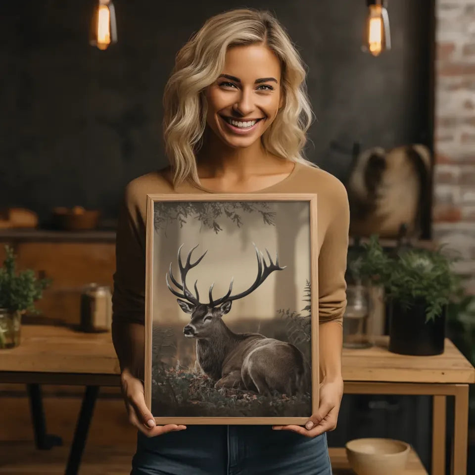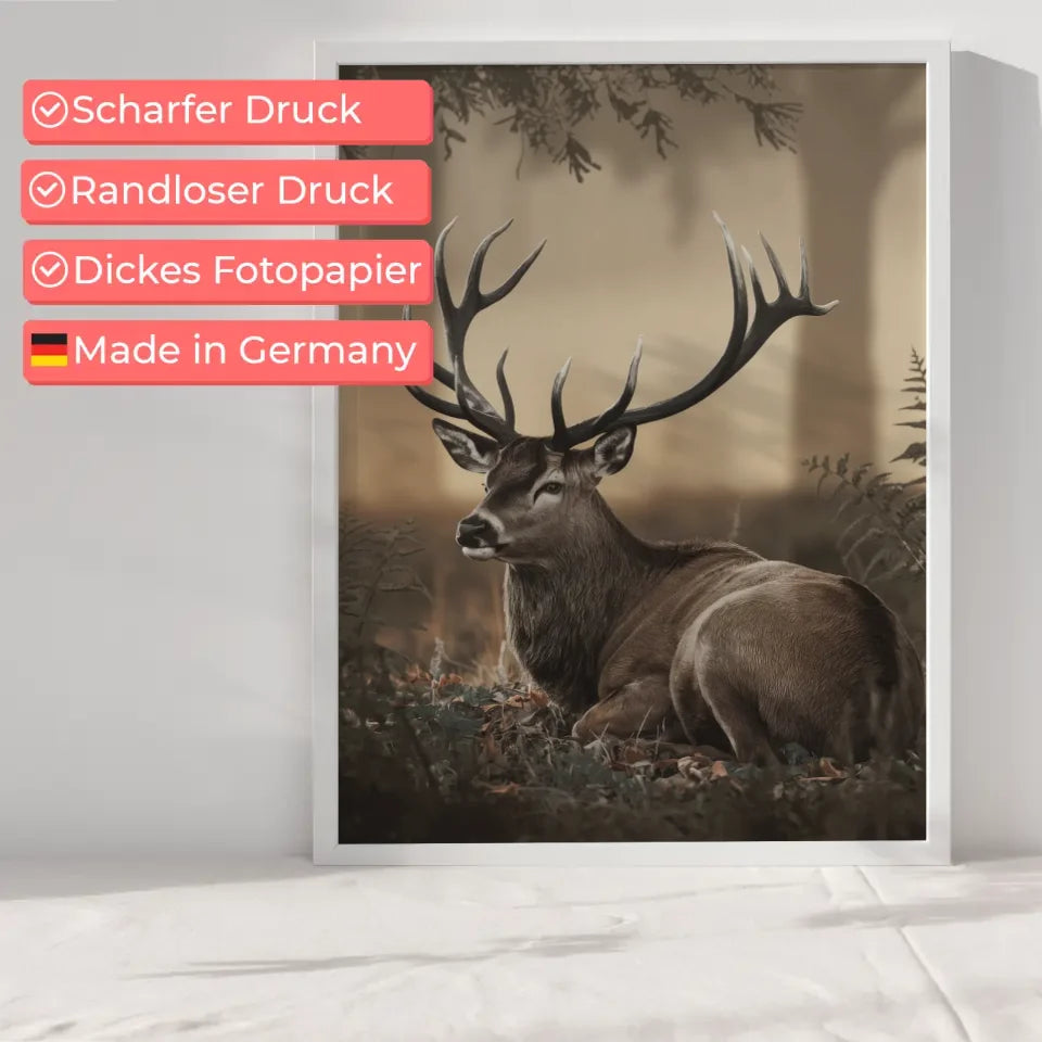 Erleben Sie die Schönheit der Natur mit unserem faszinierenden MajestĂ€tischer Hirsch Poster im sanften goldenen Waldlicht fĂŒr Ihr Zuhause. Dieses Kunstwerk gehört zur Kategorie Tiere und zeigt einen beeindruckenden Hirsch, der in einer ruhigen Waldumgebung ruht. Das Poster fĂ€ngt die Essenz der Natur ein und bringt eine friedliche AtmosphĂ€re in Ihr Zuhause. Der sanfte, goldene Hintergrund strahlt WĂ€rme aus und vermittelt das GefĂŒhl von Morgen- oder AbenddĂ€mmerung, was das Bild besonders eindrucksvoll macht. Der Hirsch, mit seinem majestĂ€tischen Geweih, wird durch die sanfte Beleuchtung hervorgehoben, die sich harmonisch auf seinem Fell und den komplexen Details seines Geweihs zeigt. Platzieren Sie dieses Poster in Ihrem Wohnzimmer, Schlafzimmer oder Arbeitsbereich und genieĂen Sie die beruhigende PrĂ€senz der Natur. Unser Poster ist nicht nur eine wunderbare Dekoration, sondern auch eine perfekte Geschenkidee fĂŒr Tierliebhaber. Verleihen Sie Ihren RĂ€umen mit diesem einzigartigen Poster ein stilvolles und warmes Ambiente!