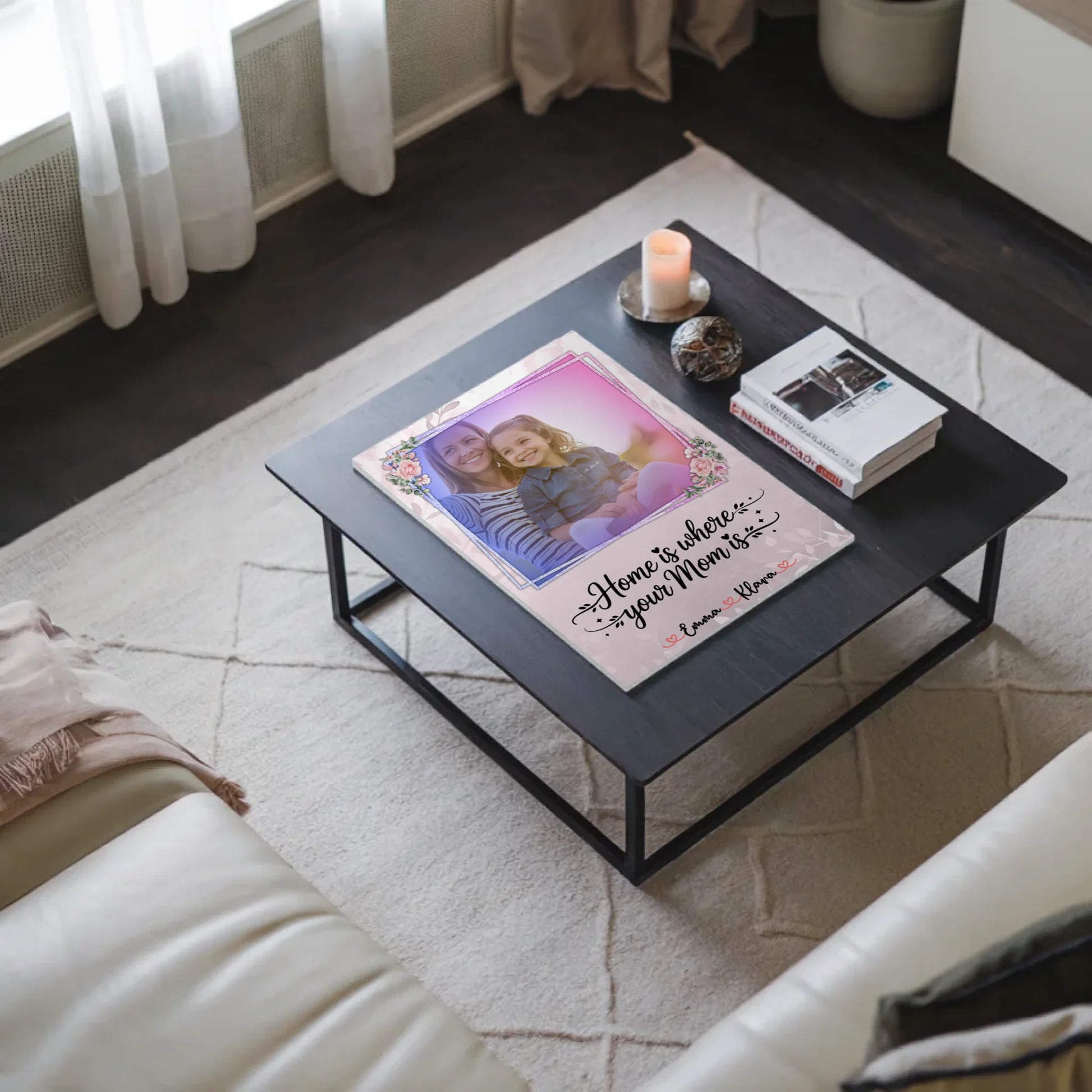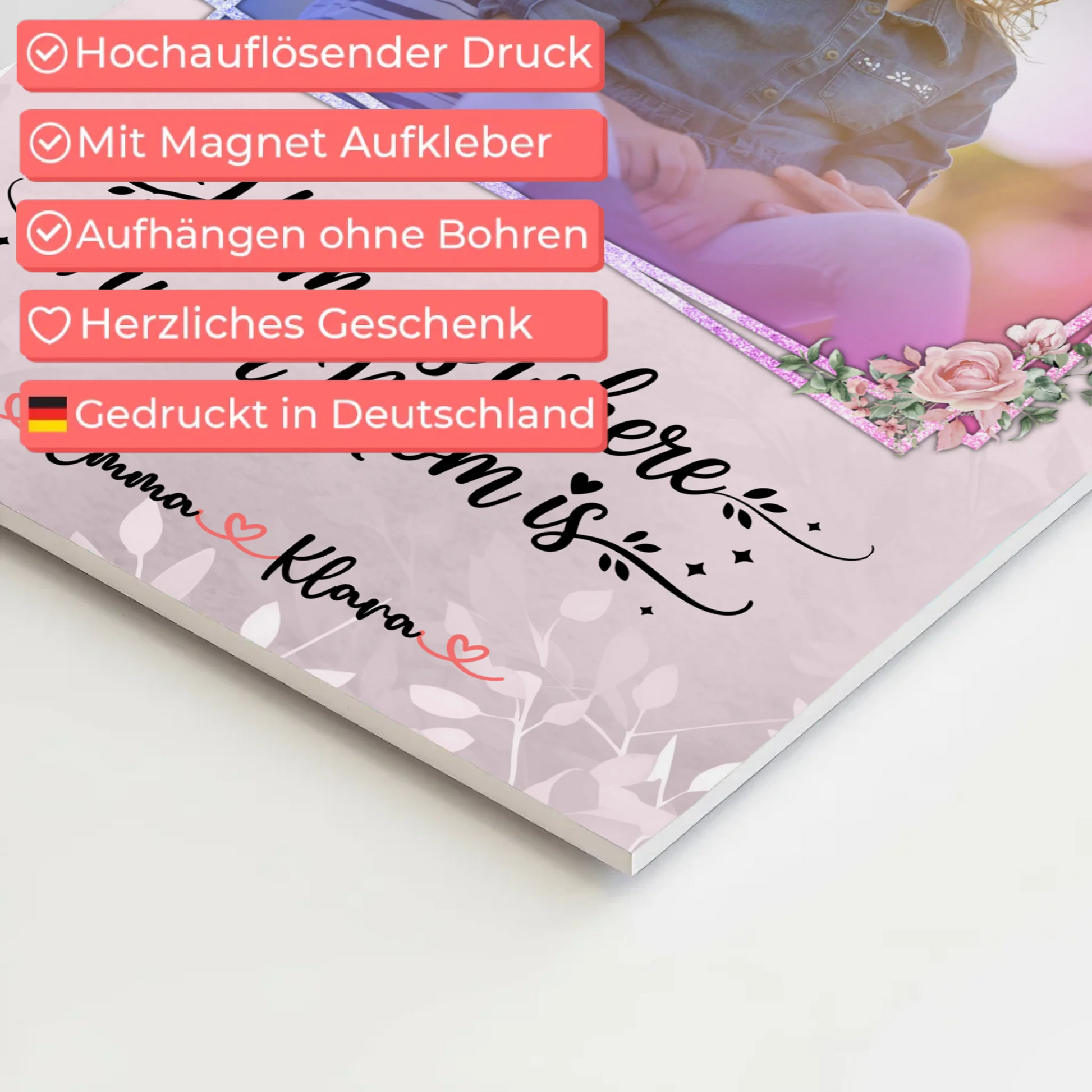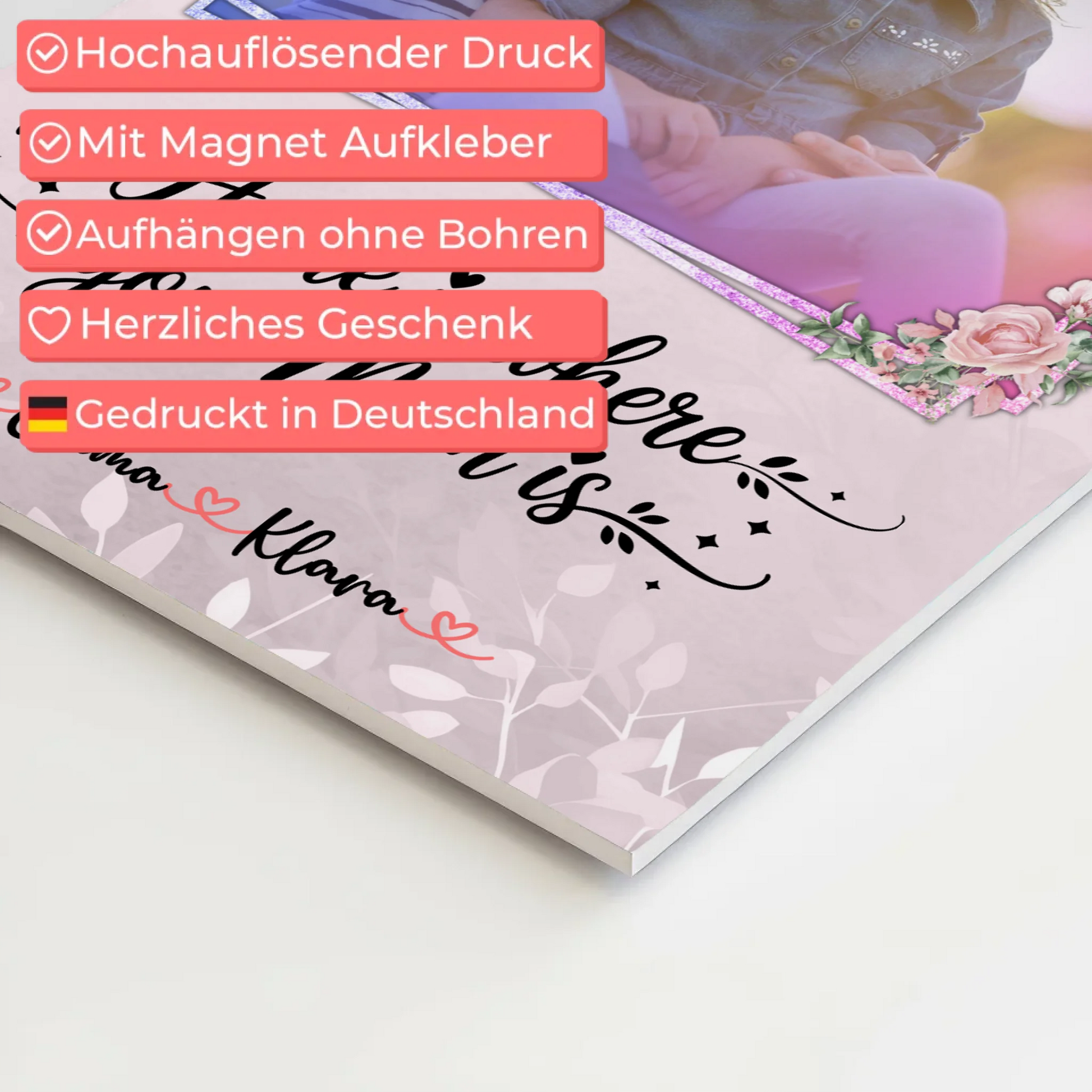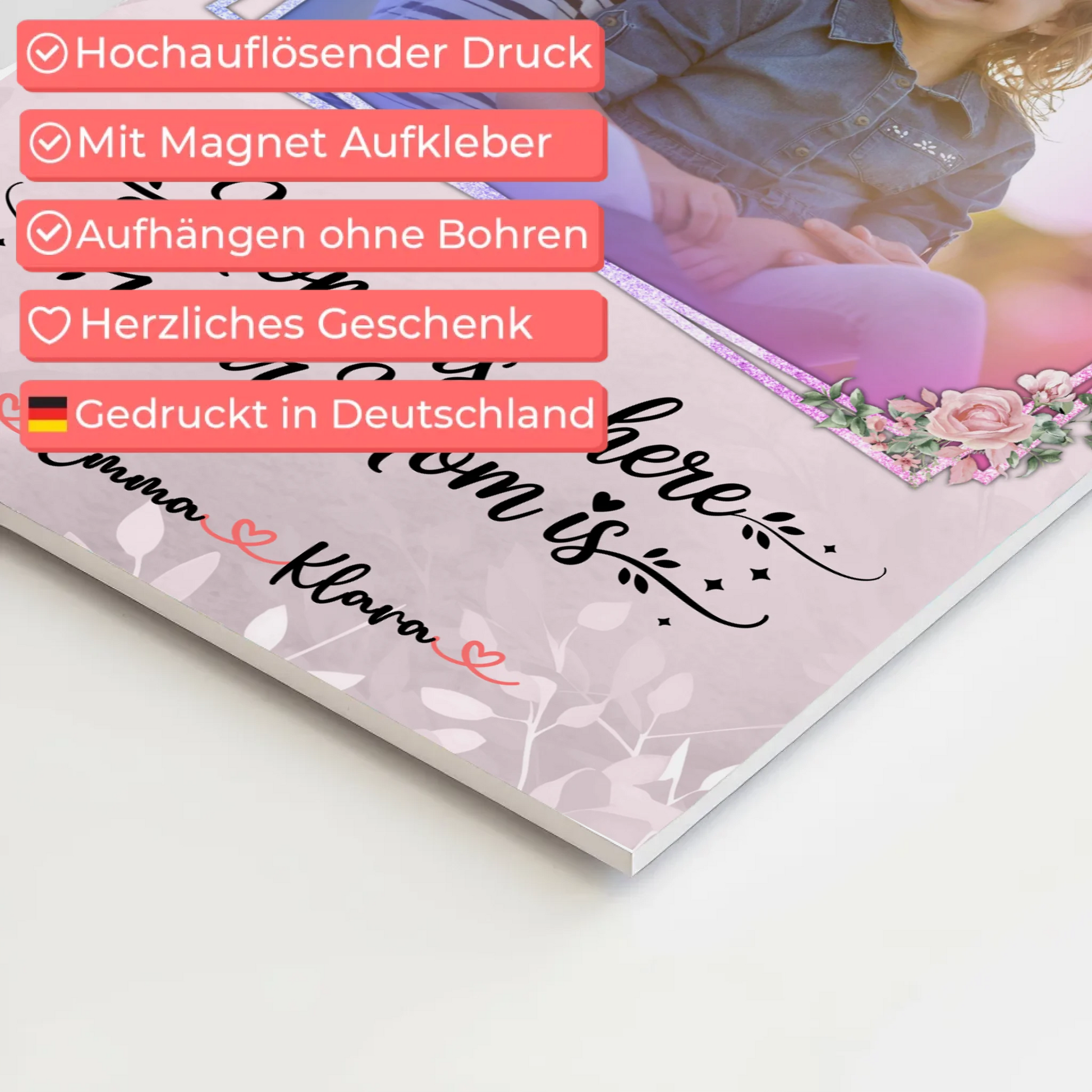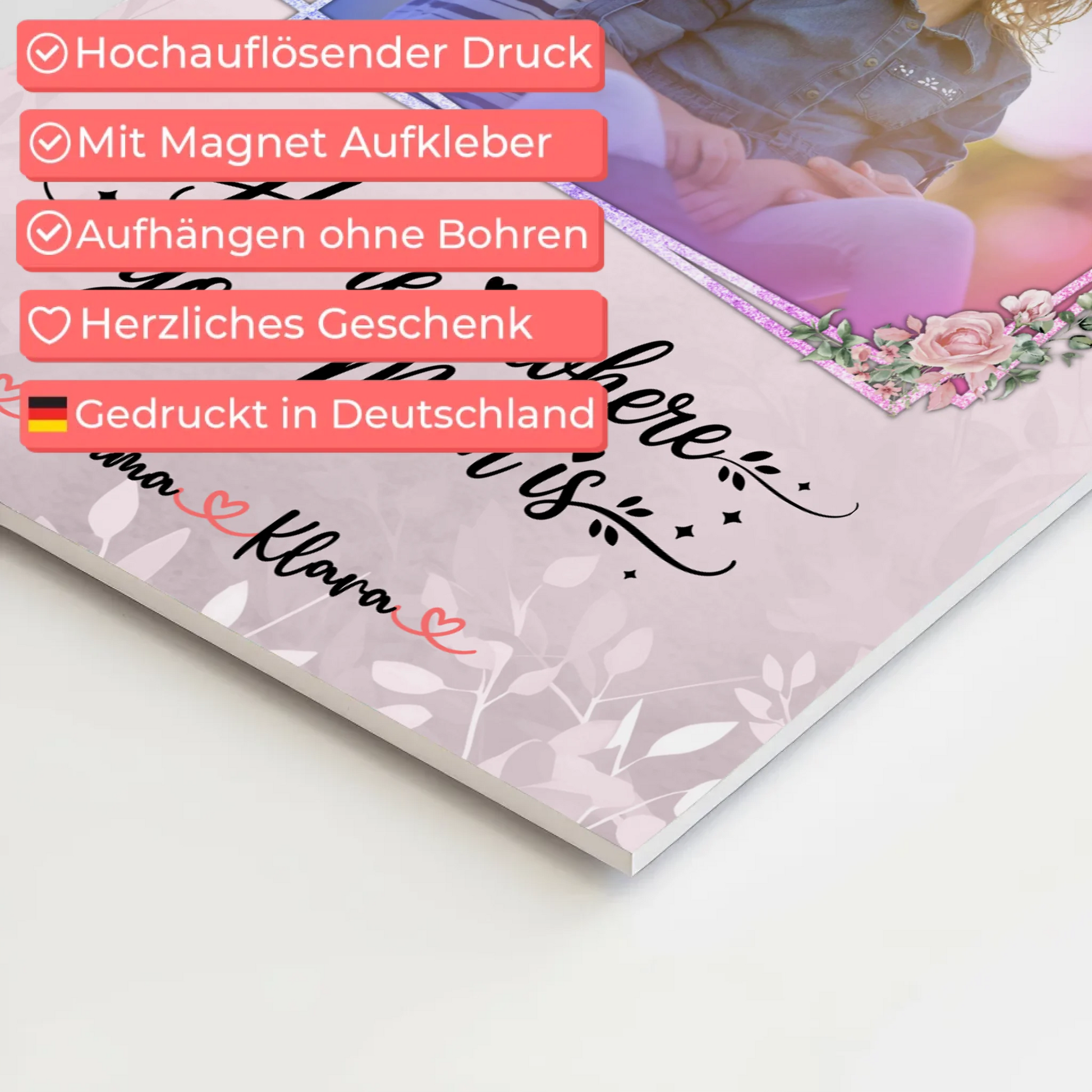 Du hältst ein Geschenk in den Händen, das eine Erinnerung für immer festhält: Ein persönliches Fotoboard, gestaltet mit deinem Lieblingsfoto, dem Namen deiner Mama und einem liebevollen Wunschtext. Stelle dir vor, wie sie das Poster an die Wand hängt und jedes Mal lächelt, wenn sie den Blick auf das Foto und die Worte Home is where your mom is richtet. Dieses Fotoboard ist die perfekte Idee für Muttertag, um Gefühle in einem klaren, hochwertigen Design auszudrücken.