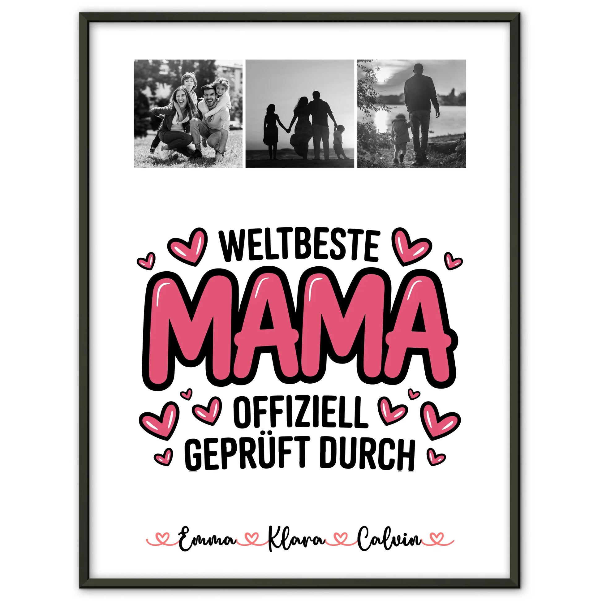 Überrasche deine Mama mit unserem einzigartigen Mama Tochter Poster Fotocollage für Mama - das offizielle Geschenk, das deine Liebe und Wertschätzung auf besondere Weise zeigt. Dieses individuell gestaltbare Geschenk ist ideal für den Muttertag oder jeden Anlass, um deiner Mama zu zeigen, wie sehr du sie schätzt. Das Design ist mit dem Spruch „Weltbeste Mama Offiziell Geprüft Durch versehen und lässt sich ganz nach deinen Wünschen personalisieren. Du kannst bis zu 3 Fotos, Namen sowie ein Hintergrundbild deiner Wahl hinzufügen, um eine ganz persönliche Fotocollage für Mama zu erstellen. Das Design bietet vielfältige Gestaltungsmöglichkeiten: Wähle den Hintergrund zwischen weiß, floralen Mustern, Wasserfarben-Style, Holz-Optik oder mit Mustern wie Sternen oder Blüten. Die Fotos kannst du farbig lassen oder mit einem Schwarz-Weiß-Filter versehen, um den gewünschten Look zu erzielen. Dieses Fotocollage für Mama ist das perfekte Geschenk für alle Mütter, die ihre Tochter oder ihren Sohn auf eine kreative und liebevolle Art präsentieren möchten. Zeige deiner Mama, wie sehr du sie liebst, mit diesem personalisierten Poster, das garantiert für Freude sorgt.