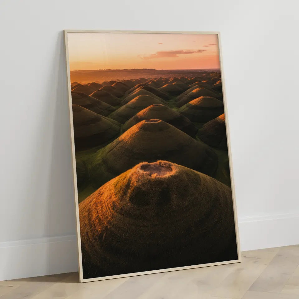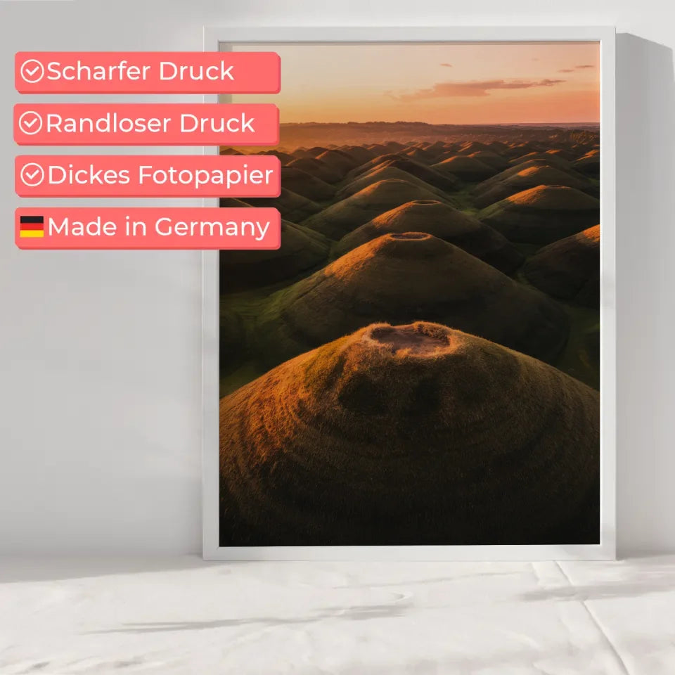 Entdecken Sie das faszinierende Poster Chocolate Hills Philippinen Panoramafoto zur Golden Hour, das Ihre Wände mit der atemberaubenden Schönheit der berühmten Chocolate Hills bereichert. Dieses eindrucksvolle Poster fängt die magische Stimmung zur Golden Hour ein, wenn das Licht die Hügel in warmen Gold- und Brauntönen erstrahlen lässt.