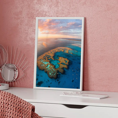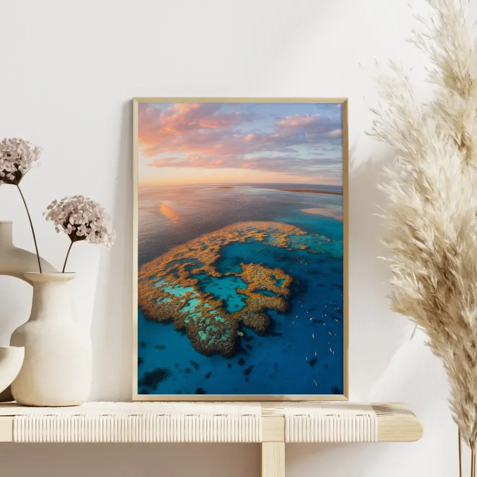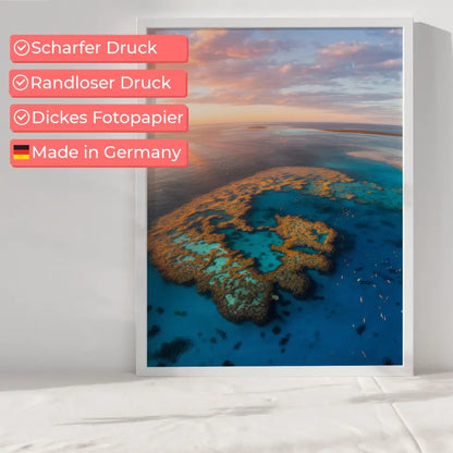WĂ€hlen Sie das Poster Great Barrier Reef Australien Panoramafoto zur Golden Hour, um Ihre WĂ€nde mit einem StĂŒck australischer Traumlandschaft zu verschönern. Lassen Sie sich von der Schönheit der Natur inspirieren und bringen Sie die Magie des Great Barrier Reef direkt in Ihr Zuhause. Jedes Poster wird mit Liebe zum Detail gefertigt und bietet Ihnen ein QualitĂ€tsprodukt, das die AtmosphĂ€re Ihres Raumes sofort aufwertet.