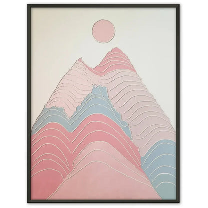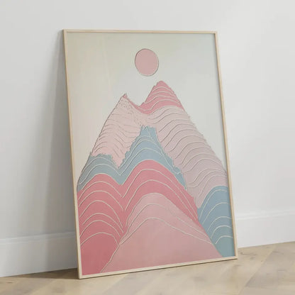 Das zarte Design, das einen rosa Kreis zeigt, der möglicherweise die Sonne oder den Mond symbolisiert, unterstreicht den minimalistischen Ansatz und bringt eine ruhige Eleganz in deine Wände. Die aufwendigen Schichten des Berges erzeugen ein mehrdimensionales Aussehen, das sowohl optisch ansprechend als auch inspirierend ist.