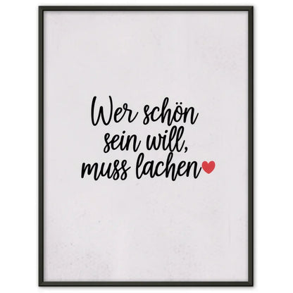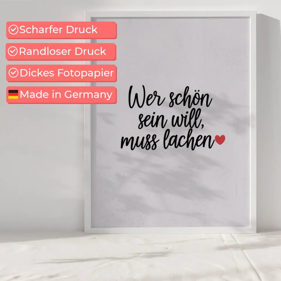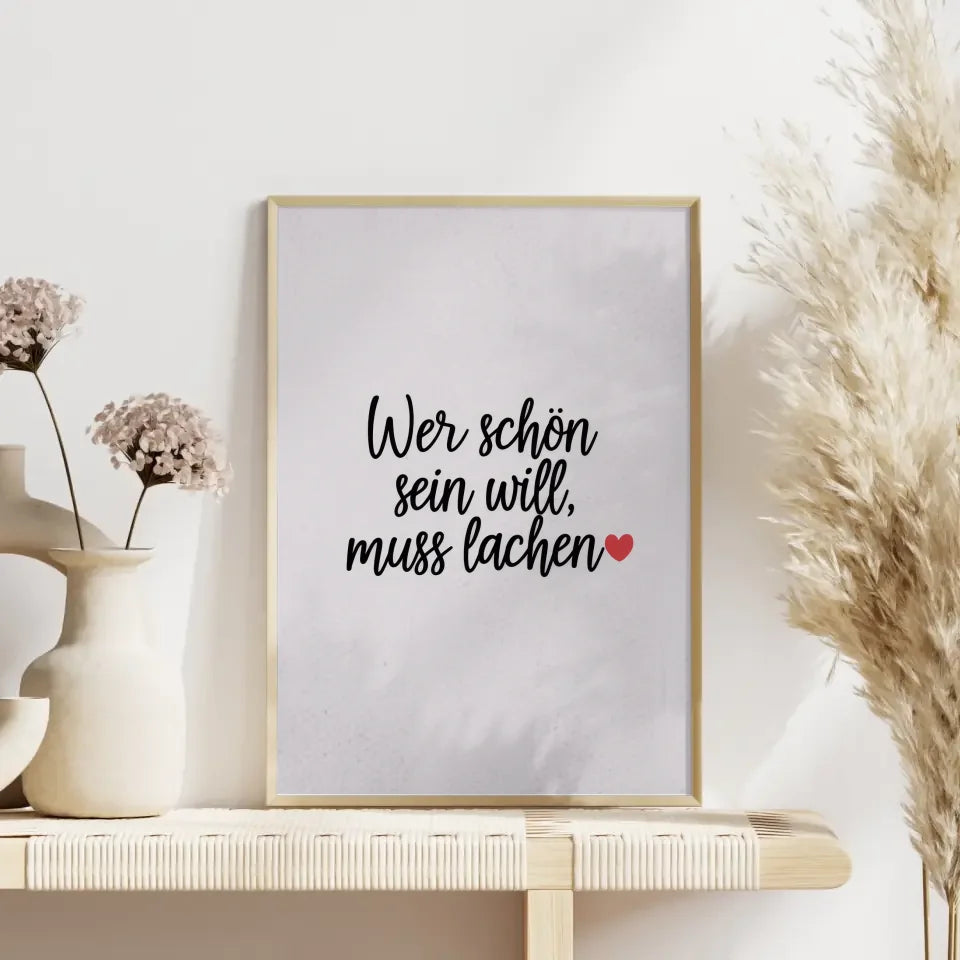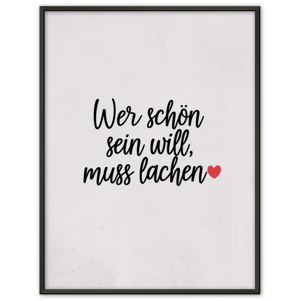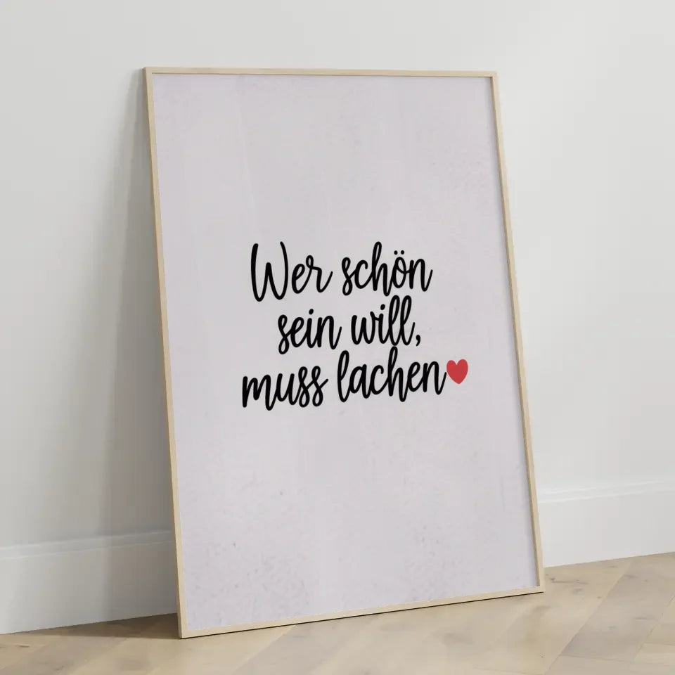 Entdecken Sie unseren minimalistischen Poster mit Schriftzug und Herzmotiv, der perfekt in jedes moderne Zuhause passt. Dieses stilvolle Wandbild gehört zur Kategorie der Spruchbilder und begeistert durch sein schlichtes, aber ausdrucksstarkes Design. Der weiĂe Hintergrund lĂ€sst die handgeschriebene Schrift mit dem inspirierenden Text Wer schön sein will, muss lachen â€ïžâ in Schwarz hervorragend zur Geltung kommen.