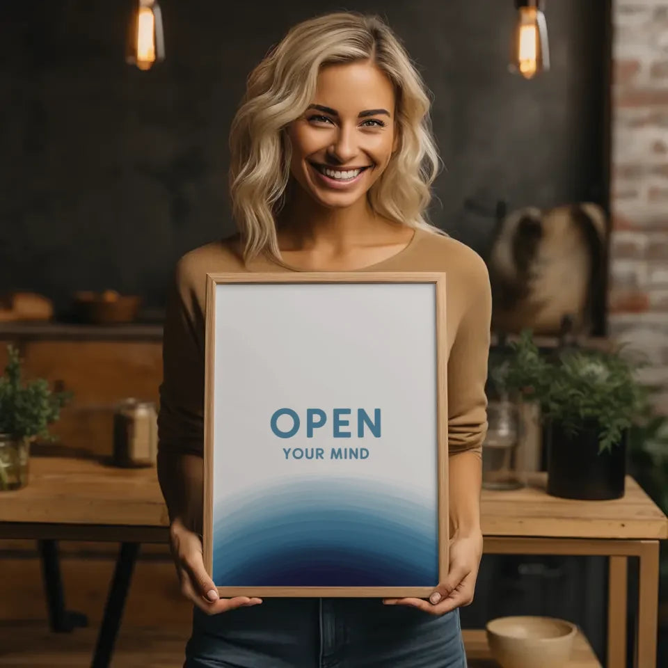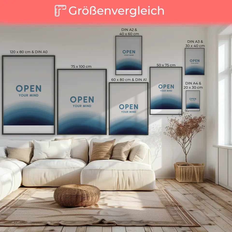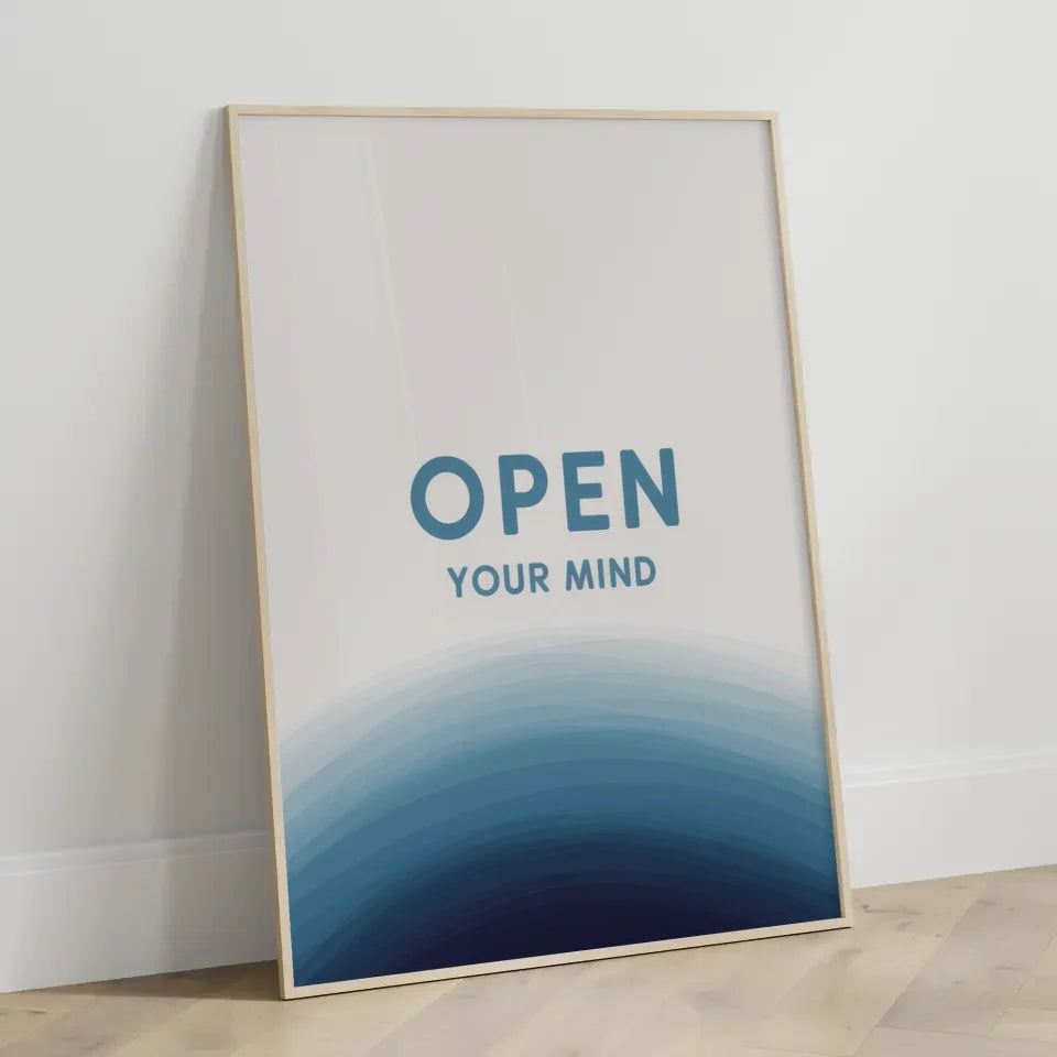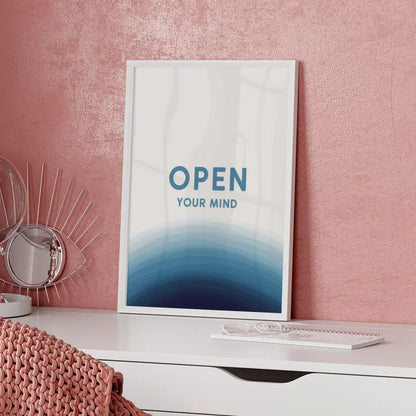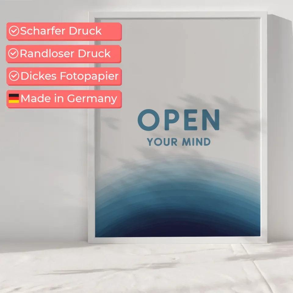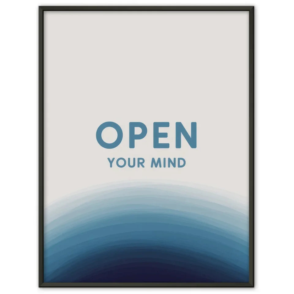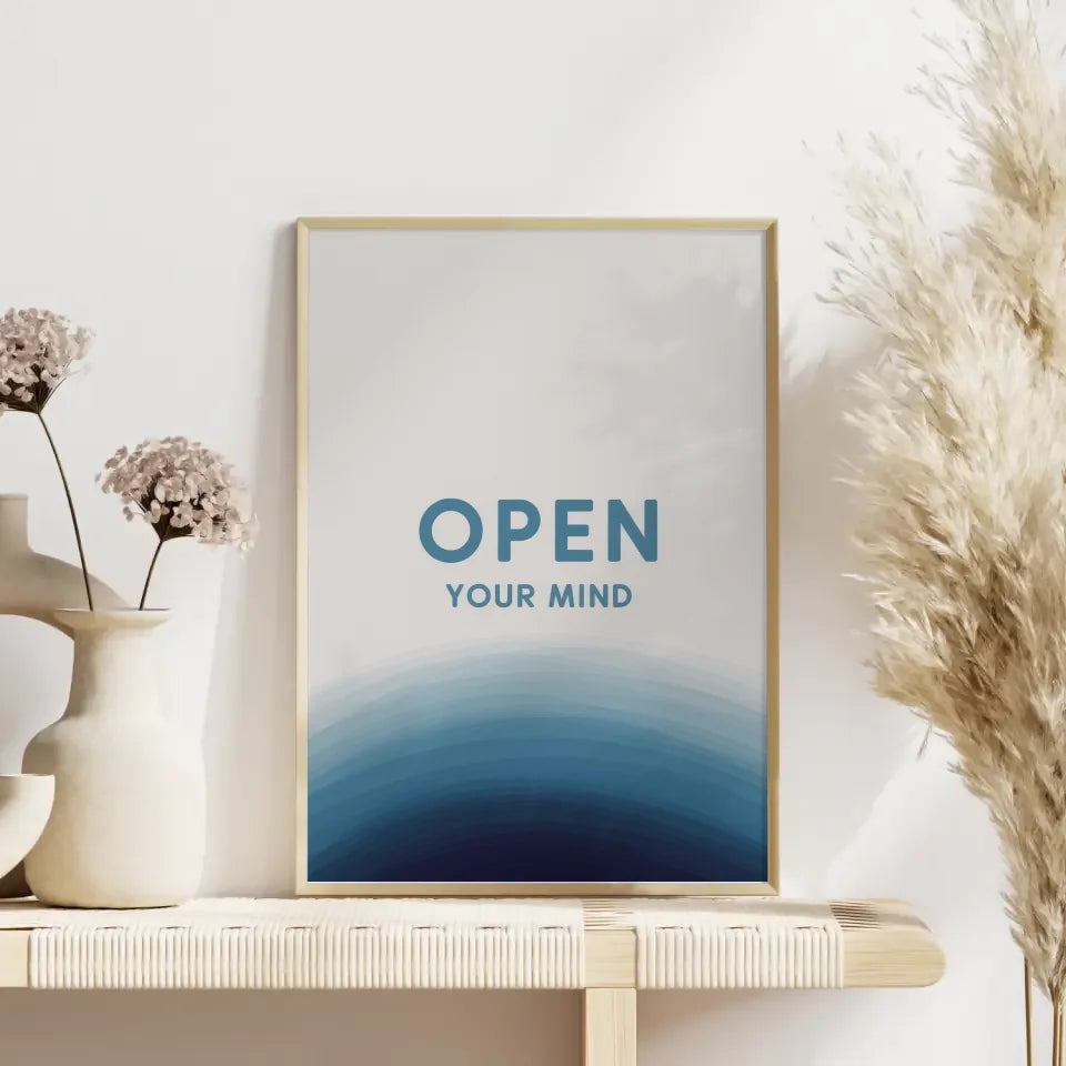 Im Mittelpunkt des Posters steht der große, auffällige Text OPEN“, der sofort ins Auge springt und gleichzeitig eine einladende Botschaft vermittelt. Direkt unterhalb dieses markanten Schriftzugs begrüßt Sie der zusätzliche Satz YOUR MIND“ in kleinerer Schrift, der zum Nachdenken anregt und Inspiration bietet. Dieses Poster ist nicht nur ein Blickfang, sondern auch ein stilvolles Statement in jedem Raum.
