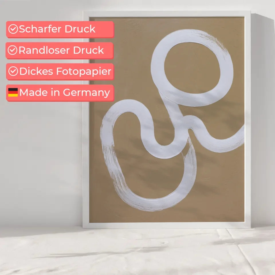 Entdecken Sie unser minimalistisches Poster mit abstrakten Linien auf beigem Hintergrund, das jedem Raum einen Hauch von Eleganz verleiht. Dieses einzigartige Wandbild gehört zur Kategorie Abstrakt und kombiniert schlichte Schönheit mit einem kreativen Touch. Die sanften, weißen, mäandrierenden Linien, die über den beigen Hintergrund fließen, schaffen eine fesselnde Komposition, die wahrhaftig zum Nachdenken anregt.