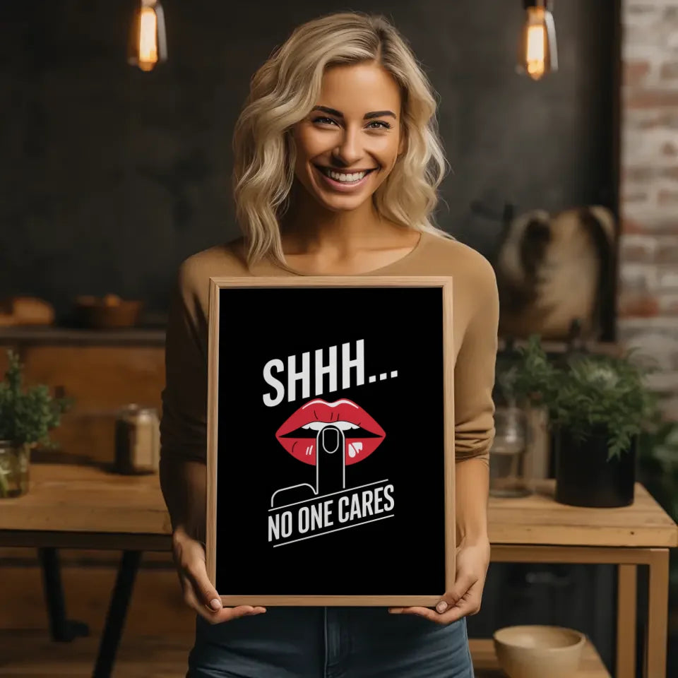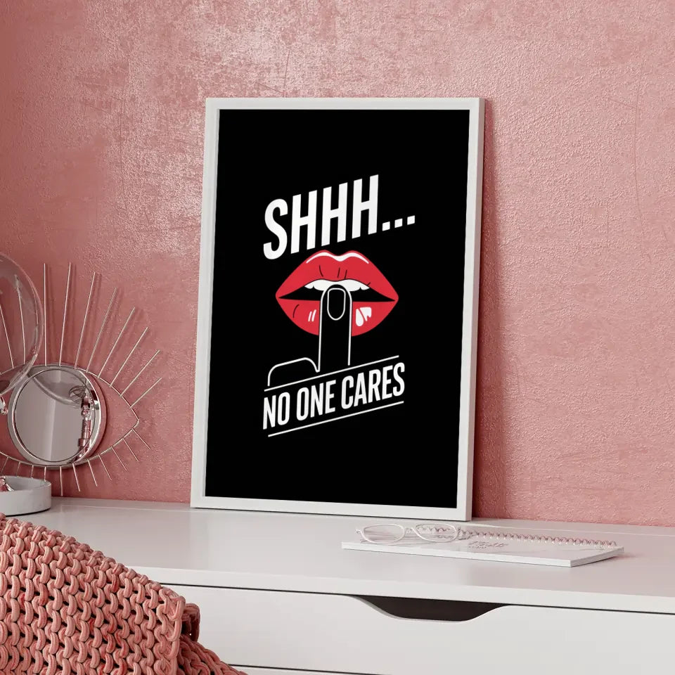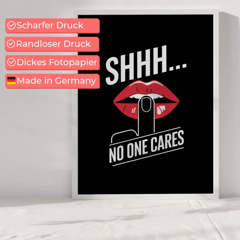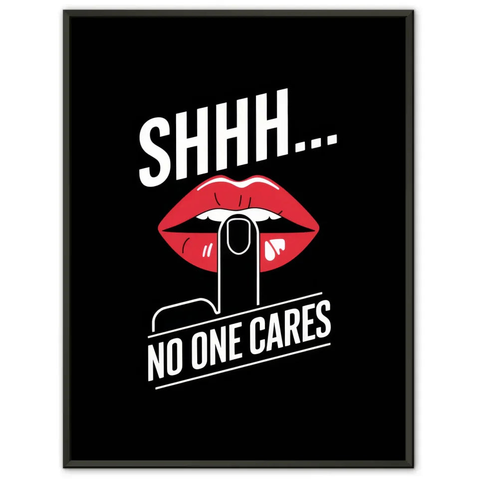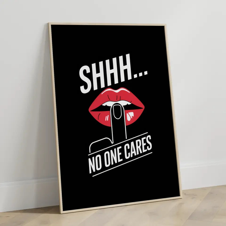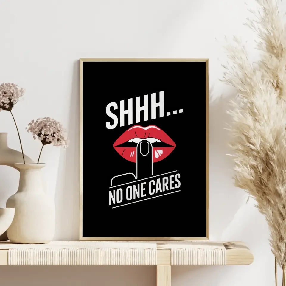 Entdecken Sie unser einzigartiges minimalistisches Poster mit Finger und roten Lippen SHHH, das in jeder modernen Raumgestaltung einen Hingucker darstellt. Dieses stilvolle Wandbild gehört zur Kategorie der Spruchbilder und vermittelt auf kreative Weise eine Botschaft, die sowohl zum Nachdenken anregt als auch begeistert. Die schlichte, aber ausdrucksstarke Illustration zeigt einen Finger auf roten Lippen und wird von den kraftvollen Texten SHHH...“ und NO ONE CARES“ in fetter weißer Schrift auf einem tiefschwarzen Hintergrund begleitet.