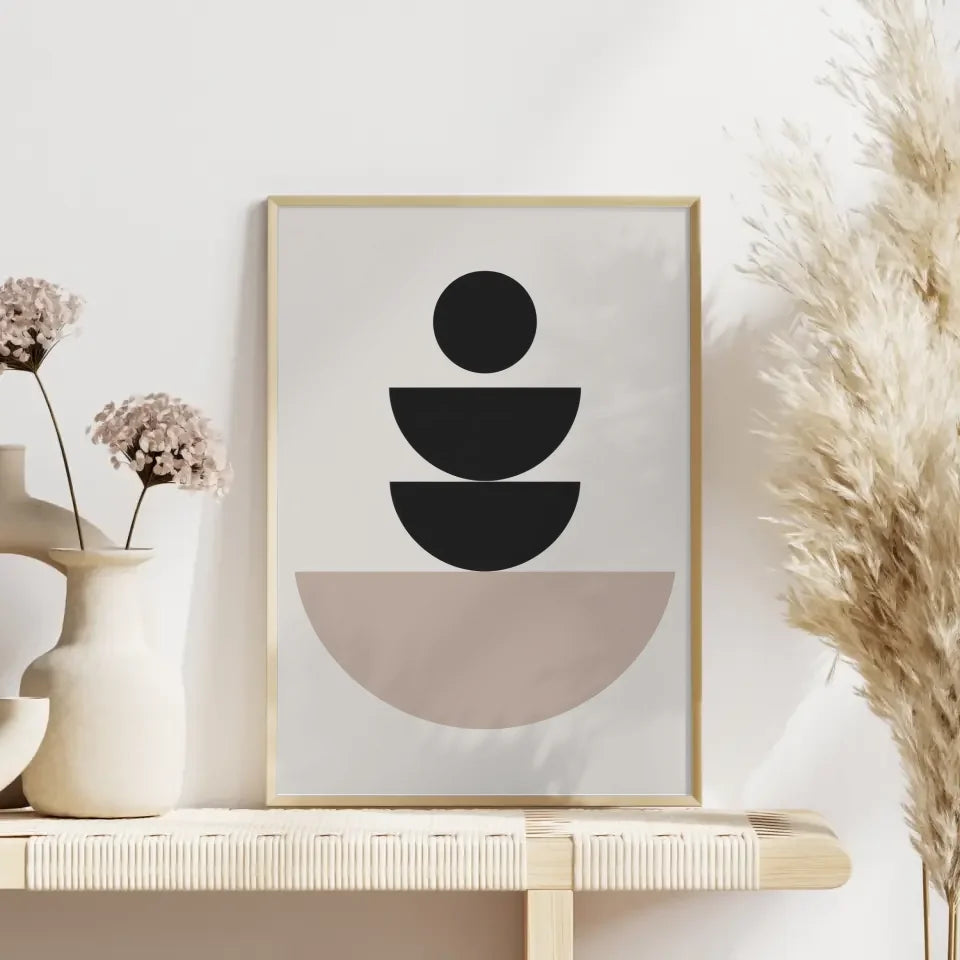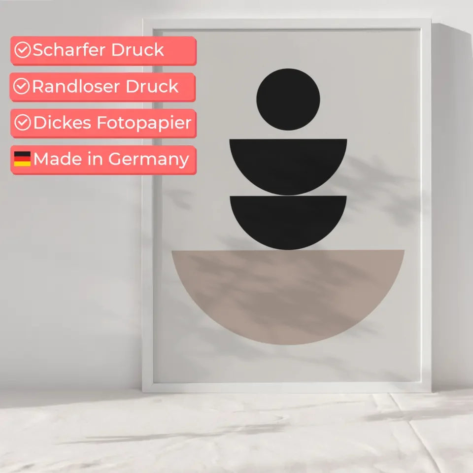 Entdecken Sie unser Poster im Boho Stil, das mit seinen minimalistischen geometrischen Formen ein modernes und stilvolles Ambiente schafft. Dieses kunstvolle Poster zeigt drei primäre Formen: einen schwarzen Kreis, der oben platziert ist, gefolgt von einem horizontalen schwarzen Halbkreis. Unterhalb des Halbkreises präsentiert sich ein größerer, beigefarbener Halbkreis, der die darüber liegenden Formen teilweise reflektiert und so eine harmonische Komposition erzeugt. Der helle beige oder cremefarbene Hintergrund des Posters harmoniert perfekt mit den dunkleren Farbtönen und sorgt für einen eleganten Kontrast. Ideal für jeden Raum, in dem Sie eine ruhige und zurückhaltende Atmosphäre schaffen möchten – dieses Poster ist die perfekte Wahl für Liebhaber des minimalistischen Designs und der Boho Ästhetik.