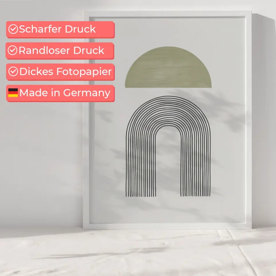 Entdecken Sie unser Minimalistisches Poster mit grünem Halbkreis und schwarzen Linien, das eine perfekte Ergänzung für Ihr Zuhause oder Büro darstellt. Dieses wundervolle Poster gehört zur Kategorie Abstrakt und überzeugt durch seine schlichte Eleganz und modernen Charme. Die halbkreisförmige Form in einer gedämpften grünen Farbe verleiht jedem Raum eine frische Note und sorgt für eine harmonische Atmosphäre.
