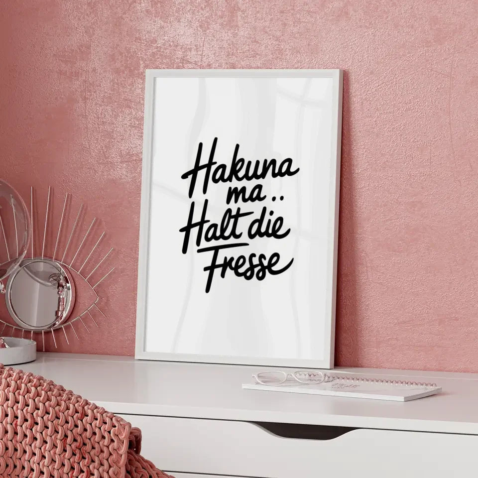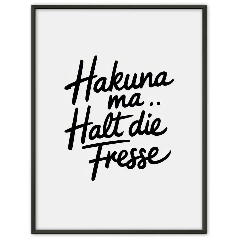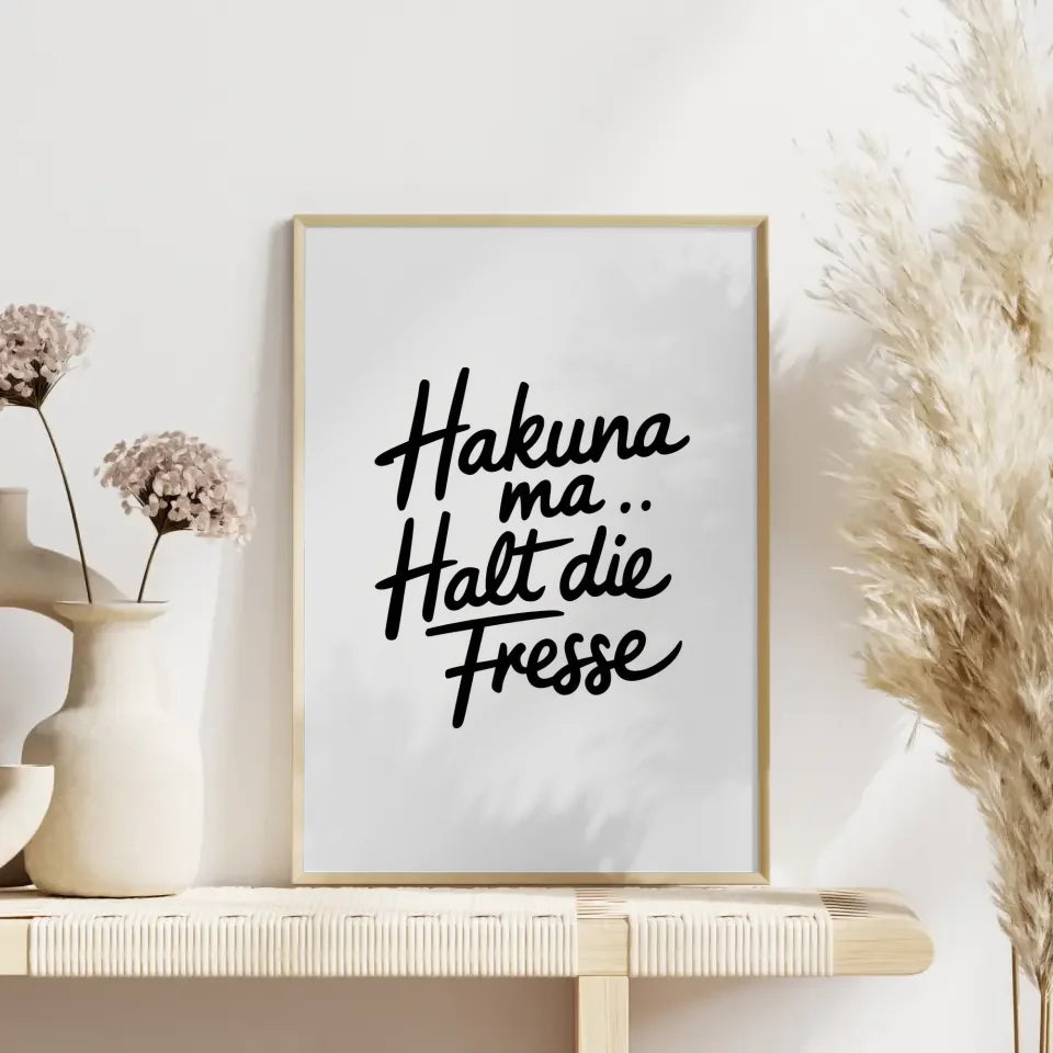Entdecken Sie unser minimalistisches Poster mit handgeschriebenem Text, das in jedem Raum für Gemütlichkeit sorgt. Dieses einzigartige Kunstwerk gehört zur Kategorie der lustigen Sprüche und bringt mit seinem modernen, fließenden Schriftzug ein Lächeln auf Ihr Gesicht. Der schwarze, kursive Text 'Hakuna ma ... Halt die Fresse“ steht vor einem schlichten weißen Hintergrund und schafft somit einen eleganten Kontrast.