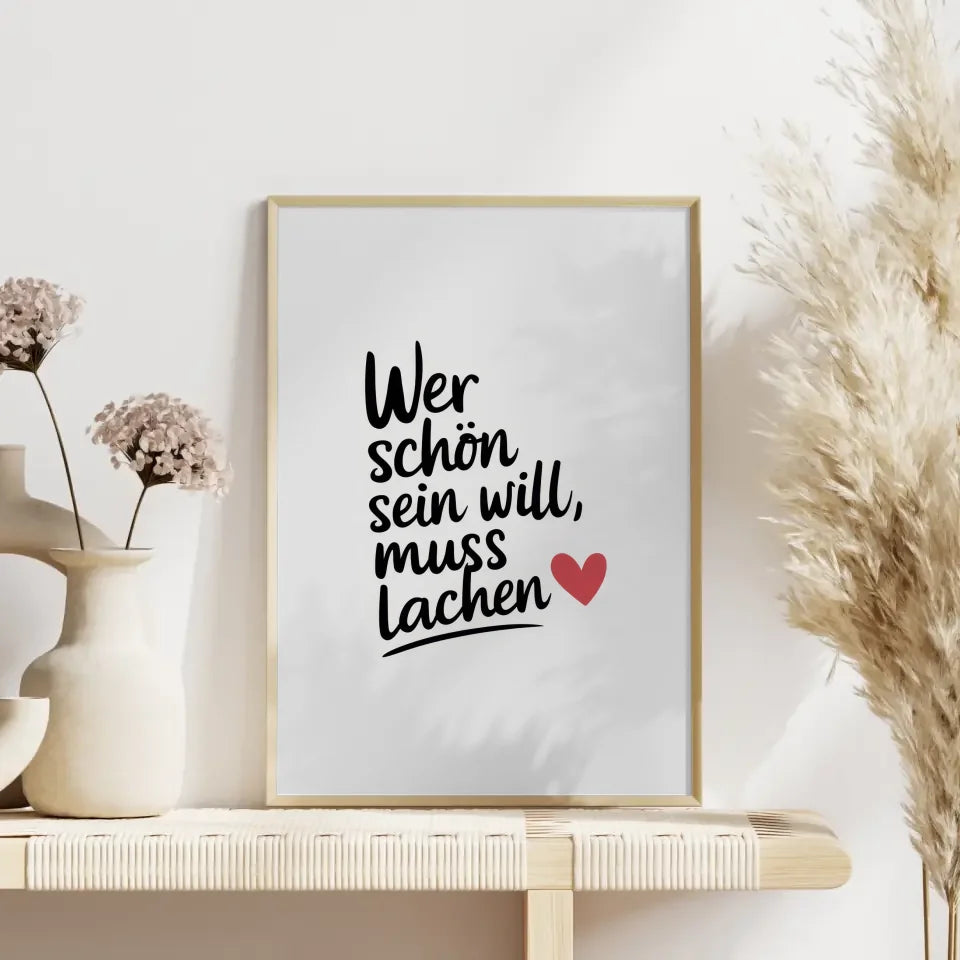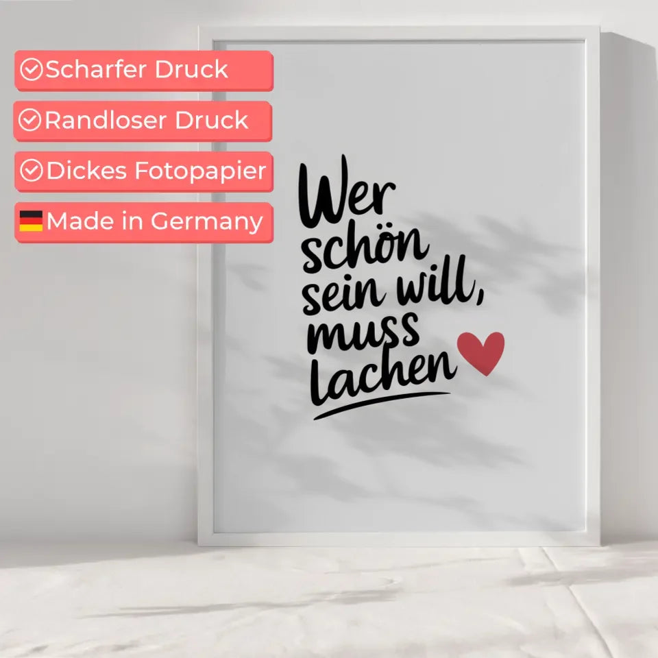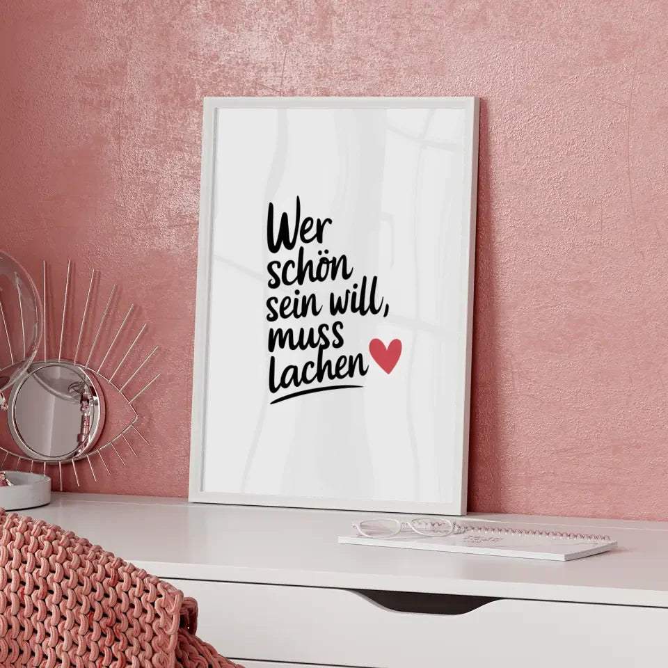Entdecken Sie unser einzigartiges minimalistisches Poster mit LĂ€cheln und Herzsymbol, perfekt fĂŒr jede Wand in Ihrem Zuhause. Dieses stilvolle Spruchbild besticht durch seinen klaren weiĂen Hintergrund und die handgeschriebene Schriftart, die den inspirierenden Text Wer schön sein will, muss lachen â€ïžâ in eleganten schwarzen Buchstaben prĂ€sentiert. Das kleine rote Herzsymbol fĂŒgt eine liebevolle Note hinzu und macht das Poster zu einem echten Hingucker.