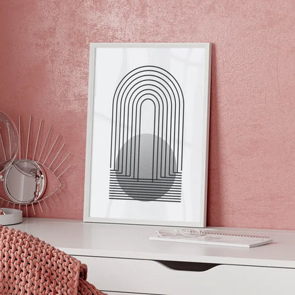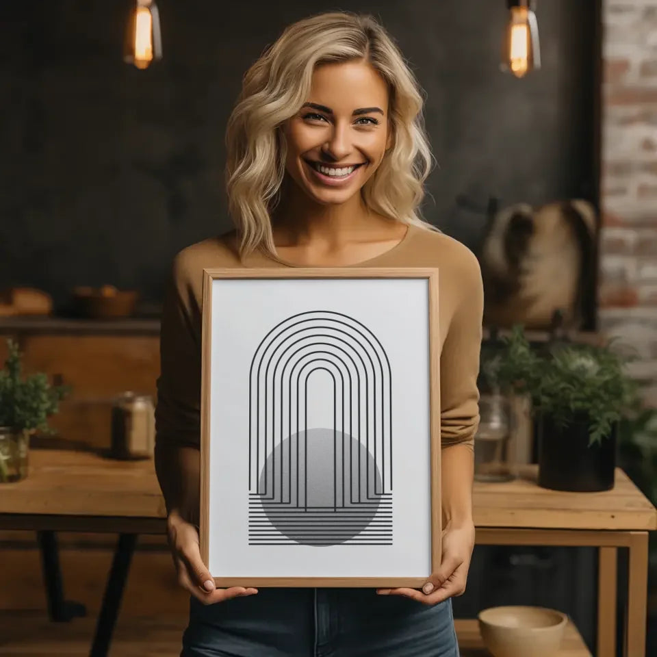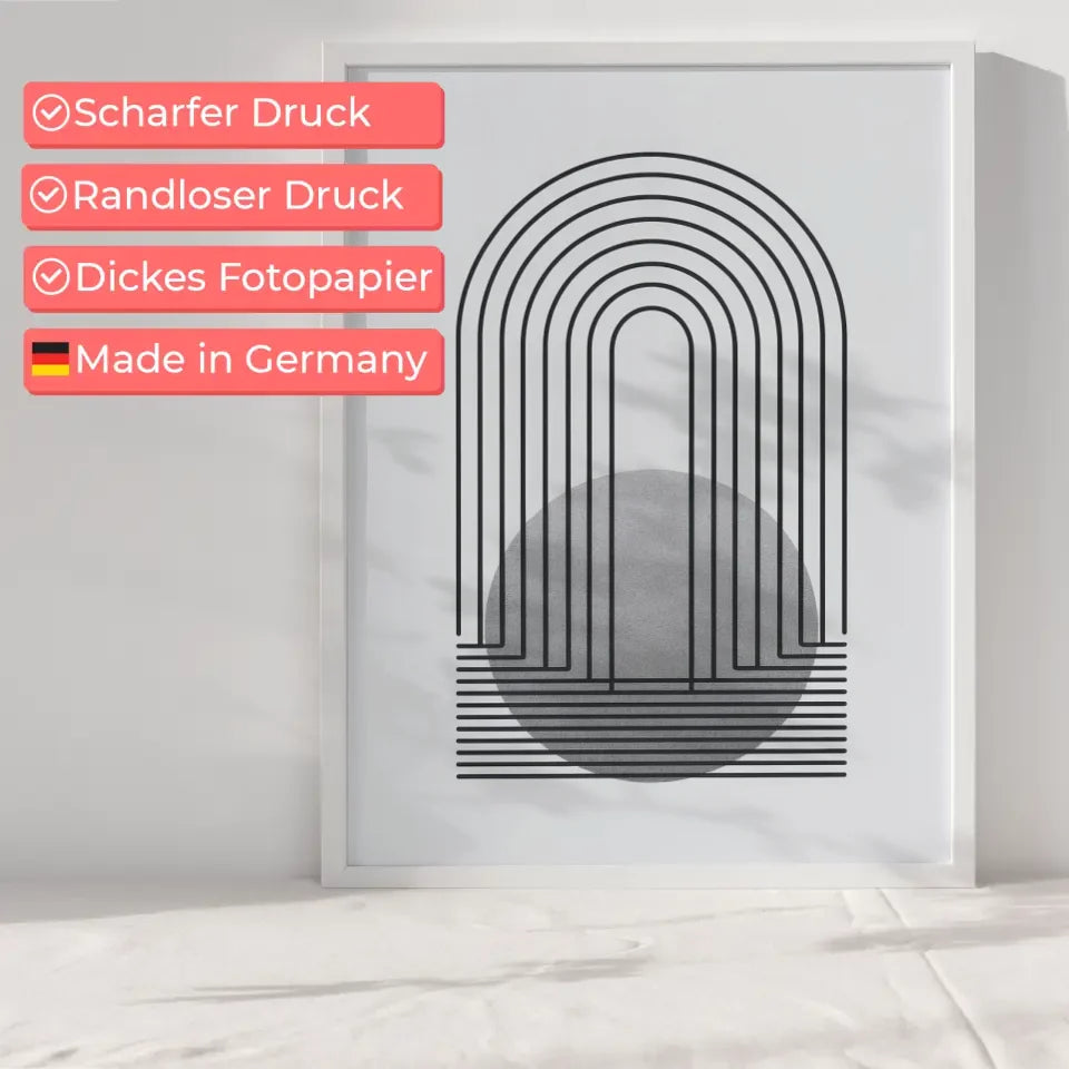 Entdecken Sie unser minimalistisches Poster mit Linien und kreisförmigem Design in grau, das Ihre Wände in eine stilvolle Oase verwandelt. Dieses Poster aus der Kategorie Abstrakt besticht durch seine klare, reduzierte Ästhetik und eignet sich perfekt für moderne Wohnräume. Das Design zeigt in der oberen Hälfte vertikale, parallele Linien, die zur Mitte hin zusammenlaufen und eine elegante bogenartige Formation bilden. Der untere Teil des Posters bildet eine ansprechende kreisförmige Form mit einer strukturierten, körnigen Oberfläche. Die gesamte Komposition kommt vor einem weißen Hintergrund hervorragend zur Geltung und lässt den Kontrast zwischen den schwarzen Linien und dem grauen Kreis eindrucksvoll wirken. Holen Sie sich dieses einzigartige Poster nach Hause und verleihen Sie Ihren Wänden einen Hauch von modernem Charme. Ideal für das Wohnzimmer, Schlafzimmer oder Home-Office – dieses Kunstwerk wird garantiert zum Blickfang. Lassen Sie sich von der Einfachheit und Eleganz dieses minimalistischen Posters inspirieren und gestalten Sie Ihre Räume neu.
