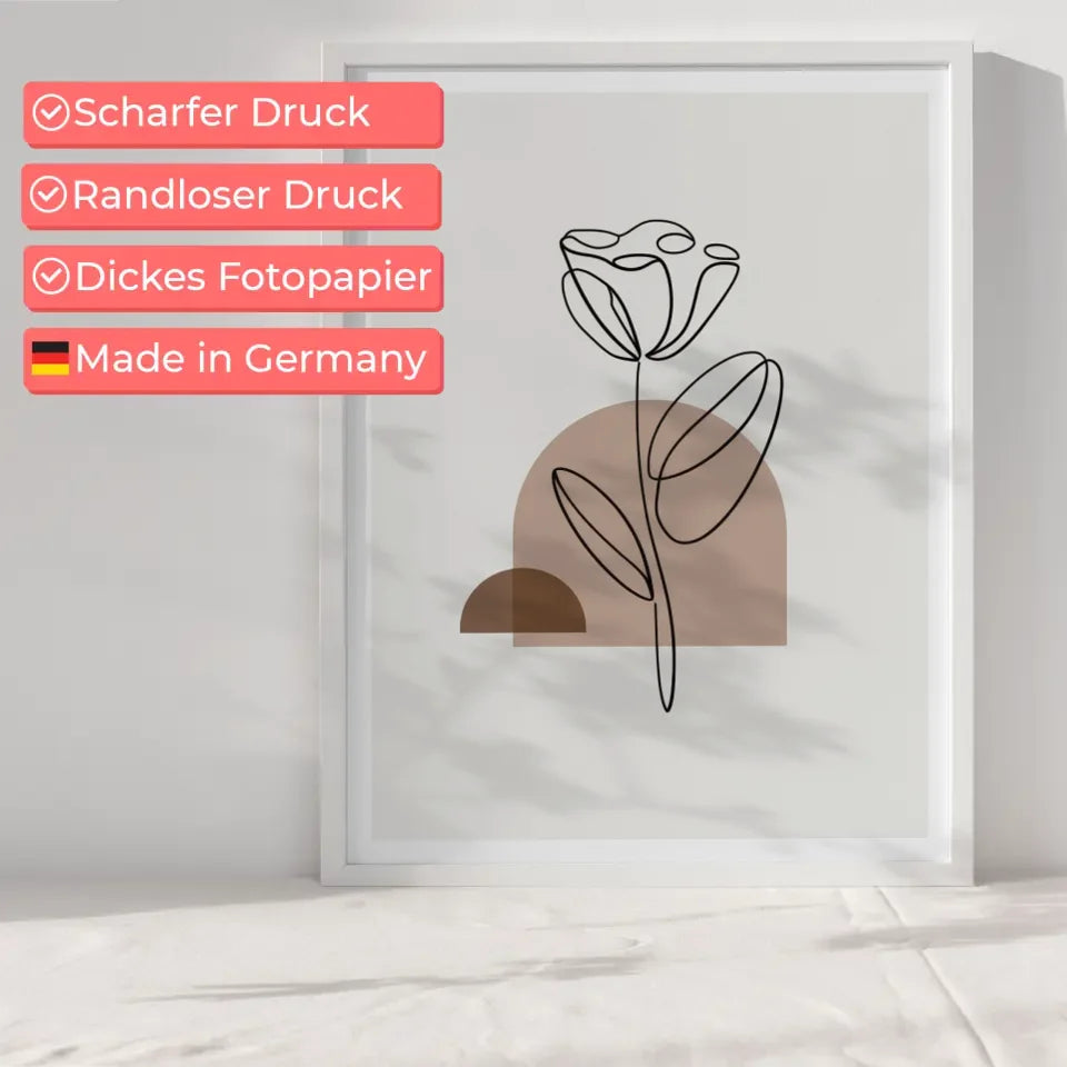 Entdecken Sie unser einzigartiges minimalistisches Poster mit liniengezeichneter Blume im Rahmen, das eine harmonische Kombination aus Eleganz und Schlichtheit bietet. Dieses Kunstwerk zeigt eine stilvolle Blume mit mehreren Blütenblättern und einem schlanken Stiel, die durch einen beigefarbenen Halbkreis im Hintergrund perfekt zur Geltung kommt. Die wunderschöne Komposition wird durch einen weiteren kleineren Halbkreis ergänzt, der links von der Blume positioniert ist. Ideal für moderne Wohnräume, verleiht dieses Poster jedem Raum eine ruhige und einladende Atmosphäre. Egal, ob Sie es im Wohnzimmer, im Schlafzimmer oder im Büro aufhängen, dieses Kunstwerk wird zum Blickfang und verleiht Ihrem Raum einen Hauch von Kreativität. Holen Sie sich jetzt unser minimalistisches Poster mit liniengezeichneter Blume im Rahmen und erleben Sie, wie einfach es ist, stilvolle Akzente zu setzen. Perfekt für Liebhaber von Line Art und minimalistischer Kunst!