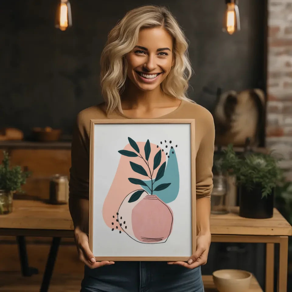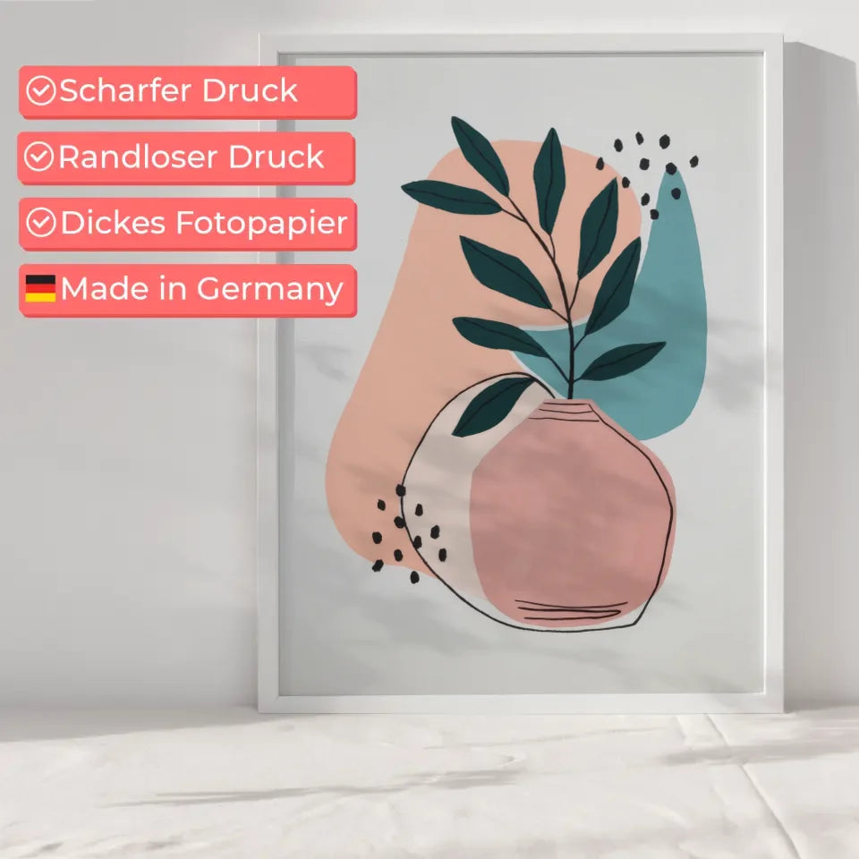 Wähle unser minimalistisches Poster mit Pflanze in rosa Vase und erlebe, wie es deinem Raum einen Hauch von Raffinesse verleiht. Mache dein Zuhause zu einem Ort, an dem moderne Kunst und Natur harmonisch zusammenkommen.