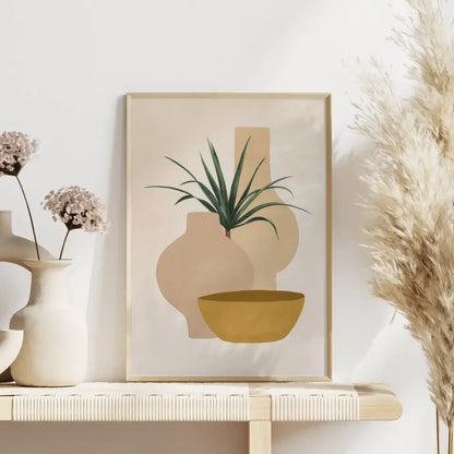 Minimalistisches Poster mit Pflanze in Vase und senfgelber Schale