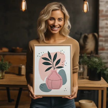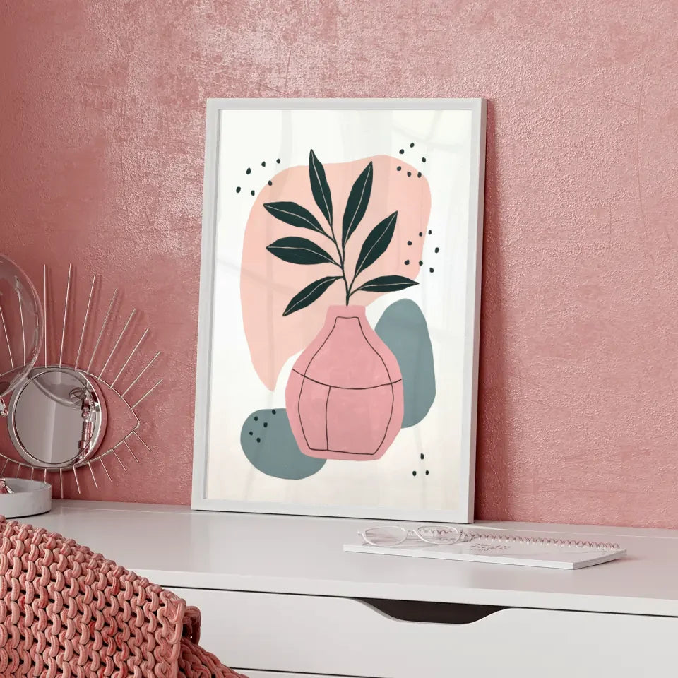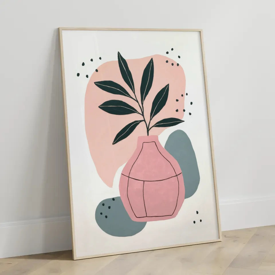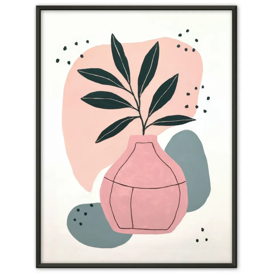 Entdecken Sie unser minimalistisches Poster mit Pflanzenmotiven und Farbakzenten, das in jedem Raum für eine entspannende Atmosphäre sorgt. Dieses hochwertige Poster zeigt ein stilvolles Design, das eine Pflanze mit dunkelgrünen Blättern in einer eleganten rosa Keramikvase abbildet. Die klare, geometrische Linienführung der Blätter harmoniert perfekt mit dem einfachen, aber äußert ansprechenden Muster der Vase. Abgerundet wird dieses Kunstwerk durch abstrakte Formen in sanften Farbtönen wie Pfirsich, Rosa und Blau, die dem Design einen modernen Touch verleihen.