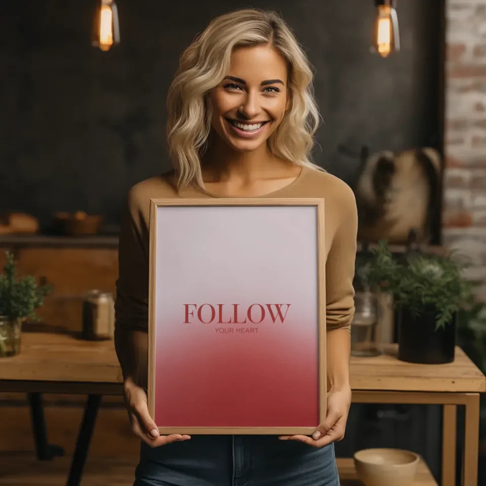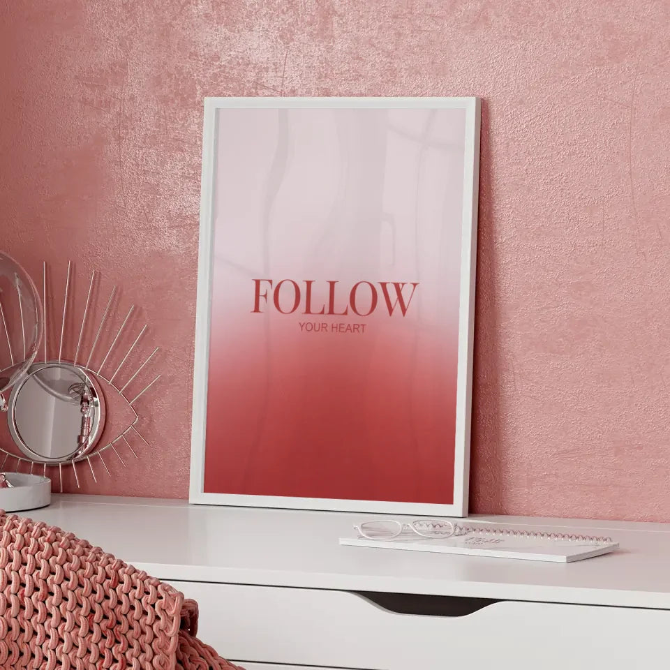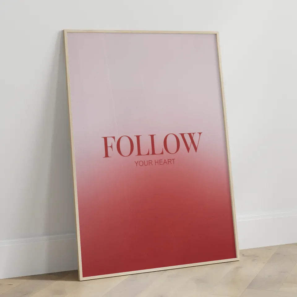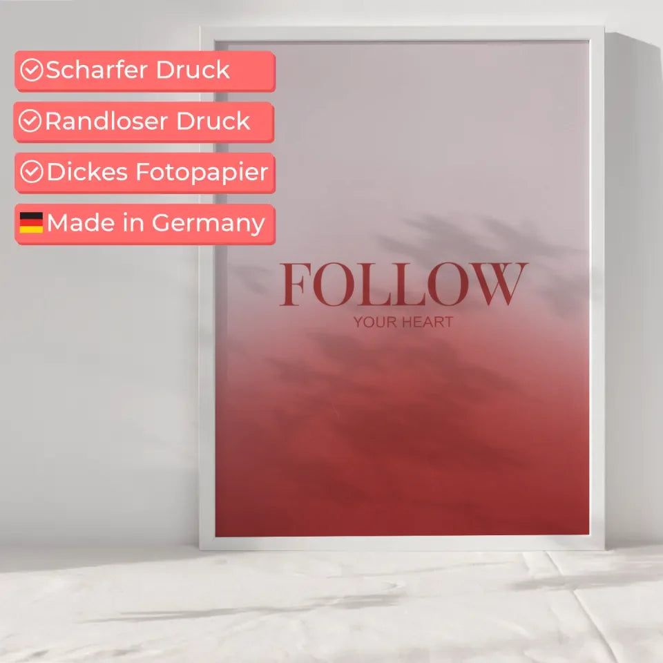 Entdecken Sie unser minimalistisches Poster mit rotem Farbverlauf und dem inspirierenden Text FOLLOW“. Dieses stilvolle Spruchbild bringt nicht nur Farbe in Ihre Räume, sondern inspiriert auch jeden Betrachter. Der rote Hintergrund besticht durch einen sanften Farbverlauf, der von einem hellen Ton oben zu einem tieferen, beruhigenden Farbton unten übergeht. In der Mitte des Posters befindet sich der auffällige Schriftzug FOLLOW“, der in fetten, großgeschriebenen Buchstaben gehalten ist und sofort ins Auge fällt.