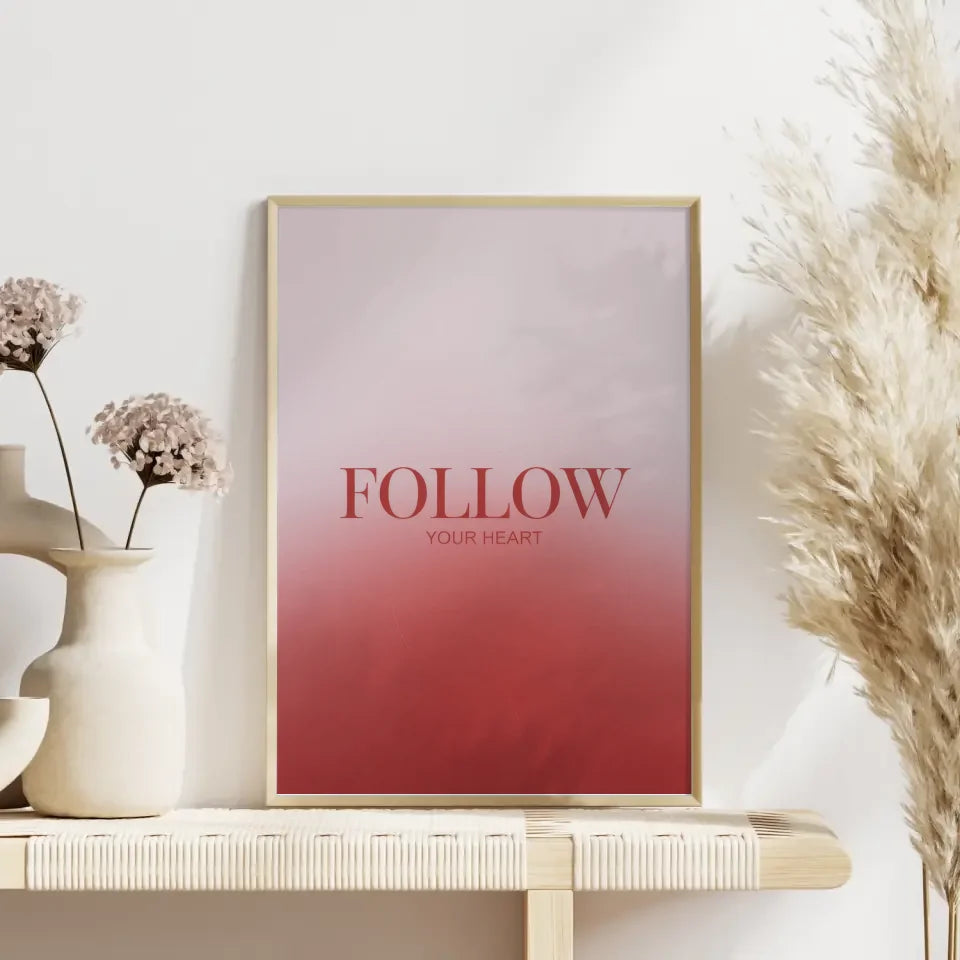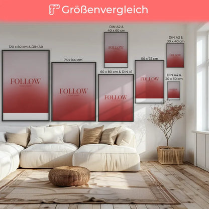 Fügen Sie das minimalistische Poster mit rotem Farbverlauf und FOLLOW Text Ihrer Sammlung hinzu und lassen Sie sich täglich von seiner Ästhetik und Botschaft inspirieren. Gestalten Sie Ihr Zuhause individuell und geschmackvoll mit unseren hochwertigen Postern und Bildern. Bestellen Sie noch heute und verwandeln Sie Ihre Wände in Kunstwerke!