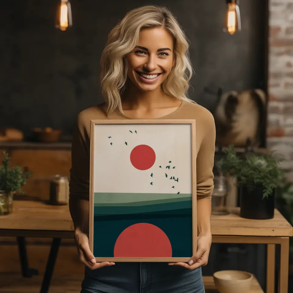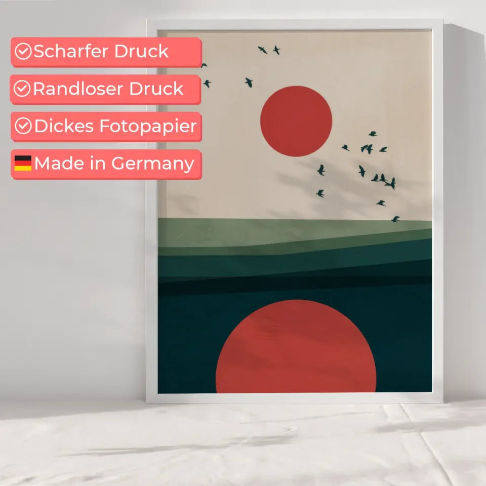 Entdecken Sie unser minimalistisches Poster mit roten Kreisen und Vögeln in Beige Braun, das perfekt in jede moderne Einrichtung passt. Dieses einzigartige Wandbild besticht durch seine reduzierte Gestaltung und harmonischen Farben. Auf einem hellbeigen Hintergrund erstrahlt ein großer, leuchtend roter Kreis, der das Auge sofort auf sich zieht. Darunter verleiht eine dunkelgrünlich-braune Schicht dem Kunstwerk Tiefe und Kontrast. Ein weiteres großformatiges rotes Element ist vor einem dunkleren, grünlich-braunen Hintergrund platziert, was das Gesamtbild zusätzlich aufwertet. Über den roten Kreisen fliegen stilisierte Silhouetten von Vögeln, die dem Poster eine dynamische Note verleihen und es zu einem echten Blickfang machen.