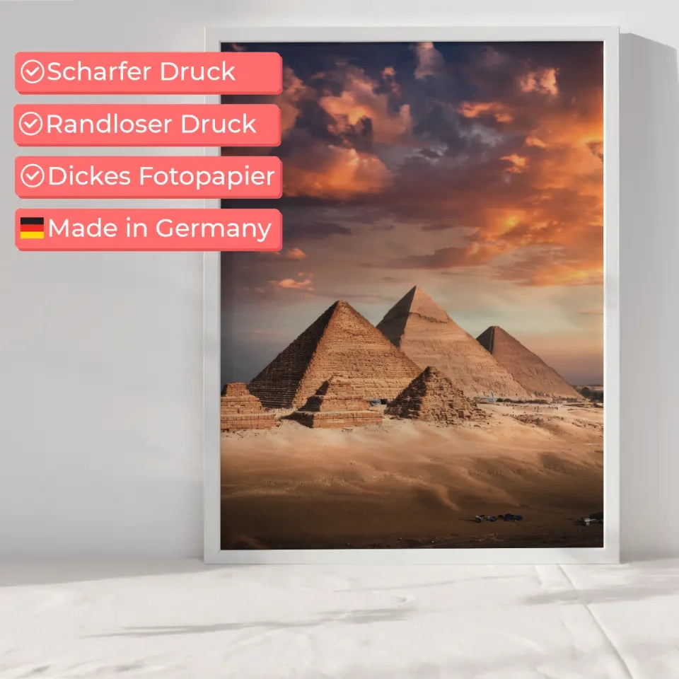 Bestellen Sie jetzt und entdecken Sie die Vielfalt unserer Poster, die jeden Raum in einen stilvollen Ort verwandeln. Gestalten Sie Ihr Zuhause mit unserem eindrucksvollen Poster und erleben Sie die Anziehungskraft der Pyramiden von Gizeh jeden Tag aufs Neue.