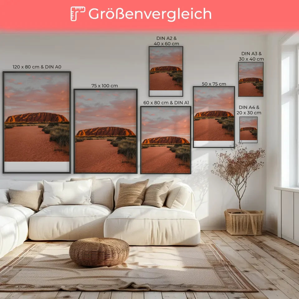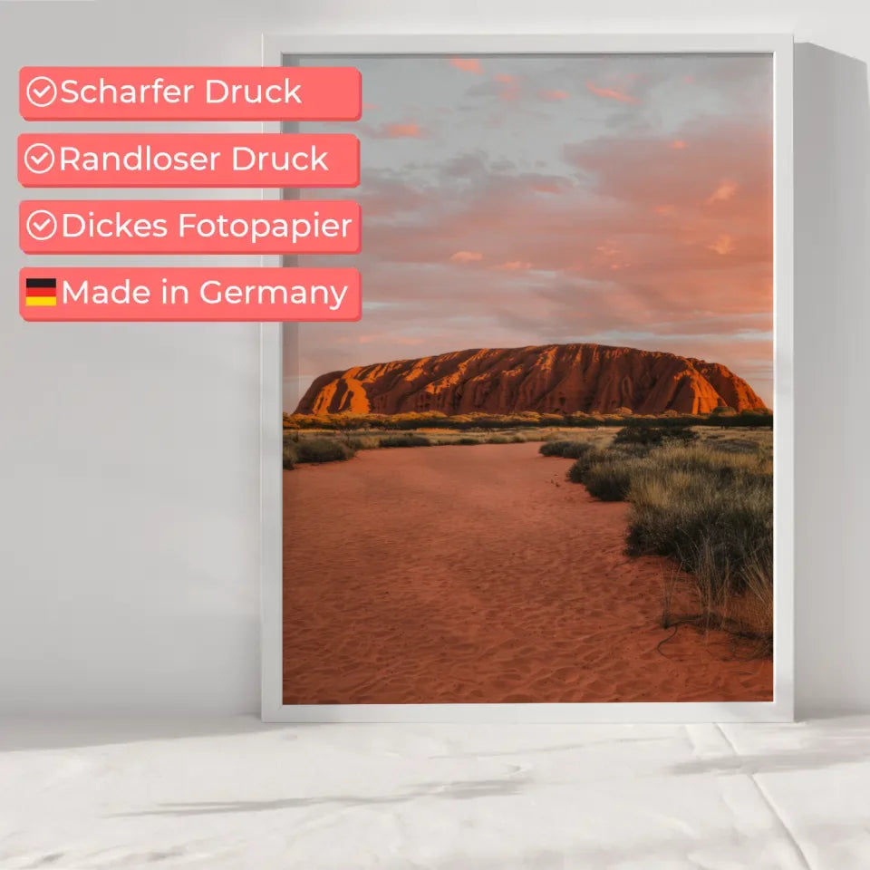 Gestalten Sie Ihre Wände mit dem einzigartigen Ayers Rock Poster zur Golden Hour und holen Sie sich ein Stück Natur zu sich nach Hause. Bestellen Sie jetzt und verwandeln Sie jeden Raum in eine Inspiration für Reisen und Abenteuer!