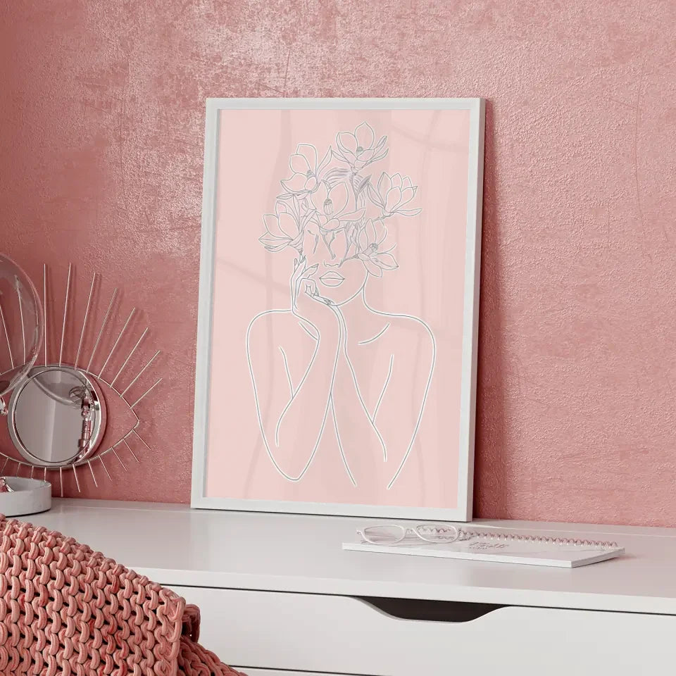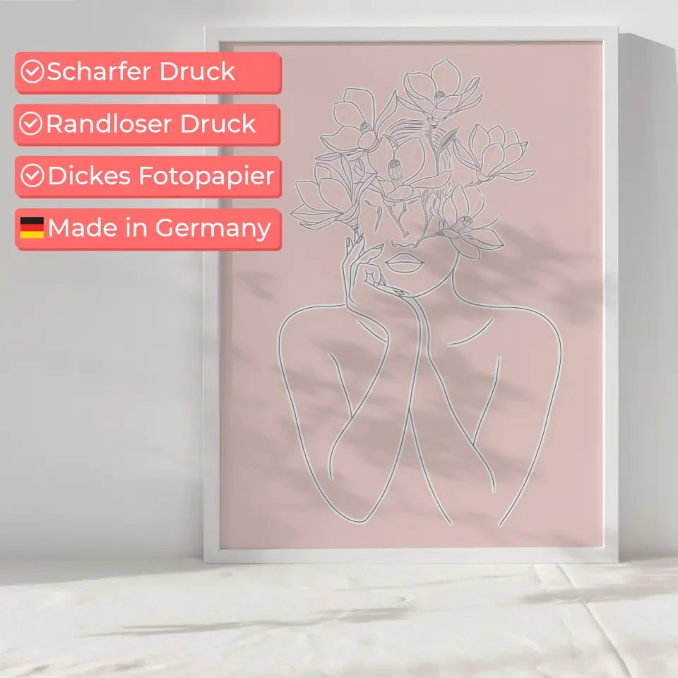 Entdecken Sie unser einzigartiges Minimalistisches Poster mit weiblicher Figur und Blumen Design, das Ihrem Raum einen Hauch von Eleganz verleiht. Dieses Poster besticht durch eine fein ausgearbeitete lineare Darstellung einer weiblichen Figur, deren Gesicht auf bezaubernde Weise von aufwendig gezeichneten Blumen, hauptsächlich Magnolien, verdeckt wird. Die kunstvoll dargestellten Blumen scheinen aus der Stirn der Figur zu wachsen und fließen sanft über ihr Gesicht. Diese außergewöhnliche Bildkomposition sorgt für ein harmonisches Zusammenspiel von Kunst und Natur.