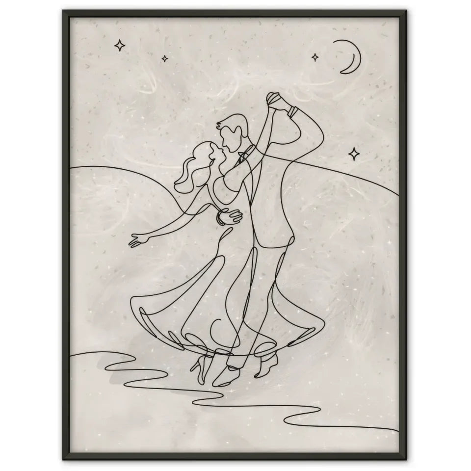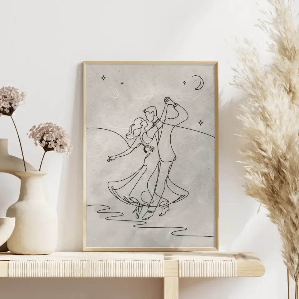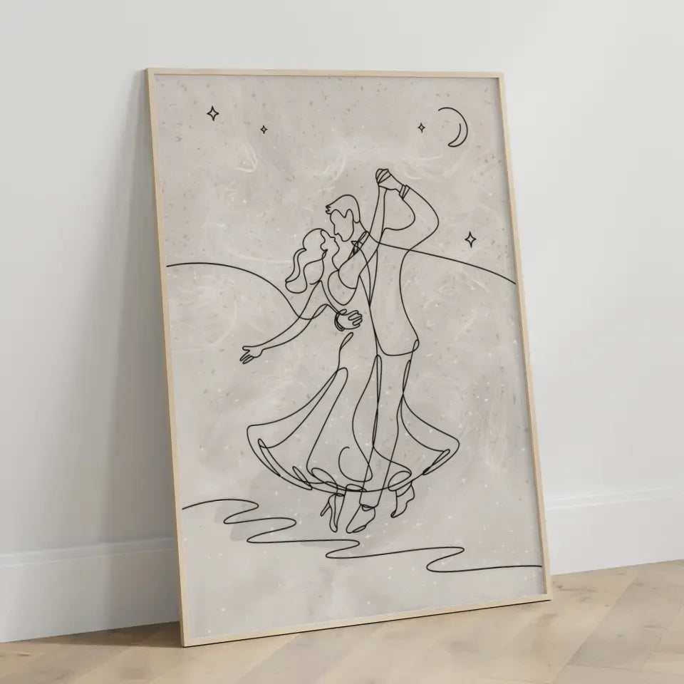 Entdecken Sie unser zauberhaftes minimalistisches Poster mit dem Titel 'Minimalistisches Poster Paar unter sternenklarem Nachthimmel tanzen'. Dieses stilvolle Wandbild ist die perfekte Ergänzung für jedes Zuhause und bringt eine romantische Atmosphäre in Ihre Räume. Die fesselnde Strichzeichnung eines Paares, das anmutig unter einem klaren Nachthimmel tanzt, fängt die Freude und Freiheit ihres Moments ein. Durch den durchgehenden Linienstil entsteht eine nahtlose, fließende Bewegung, die das Herz berührt.