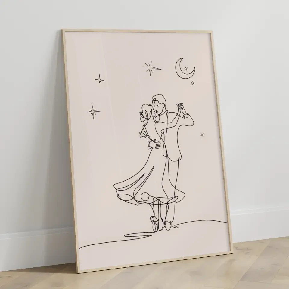Entdecken Sie unser zauberhaftes minimalistisches Poster mit dem Titel 'Minimalistisches Poster Paar unter sternenklarem Nachthimmel tanzen'. Dieses stilvolle Wandbild ist die perfekte Ergänzung für jedes Zuhause und bringt eine romantische Atmosphäre in Ihre Räume. Die fesselnde Strichzeichnung eines Paares, das anmutig unter einem klaren Nachthimmel tanzt, fängt die Freude und Freiheit ihres Moments ein. Durch den durchgehenden Linienstil entsteht eine nahtlose, fließende Bewegung, die das Herz berührt.