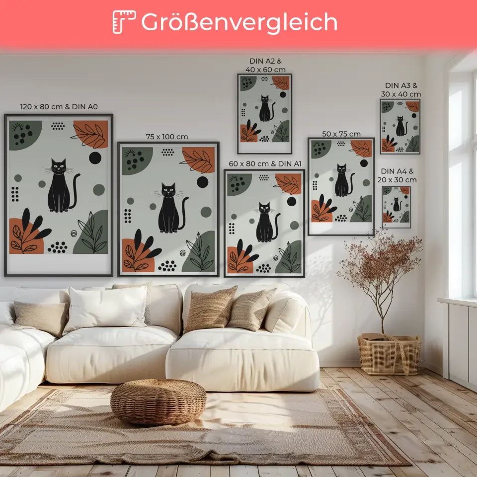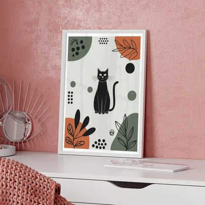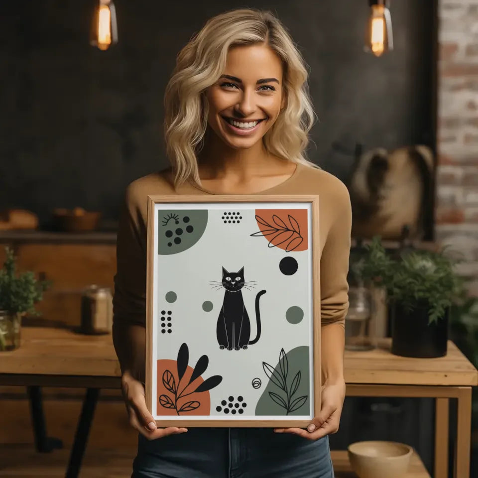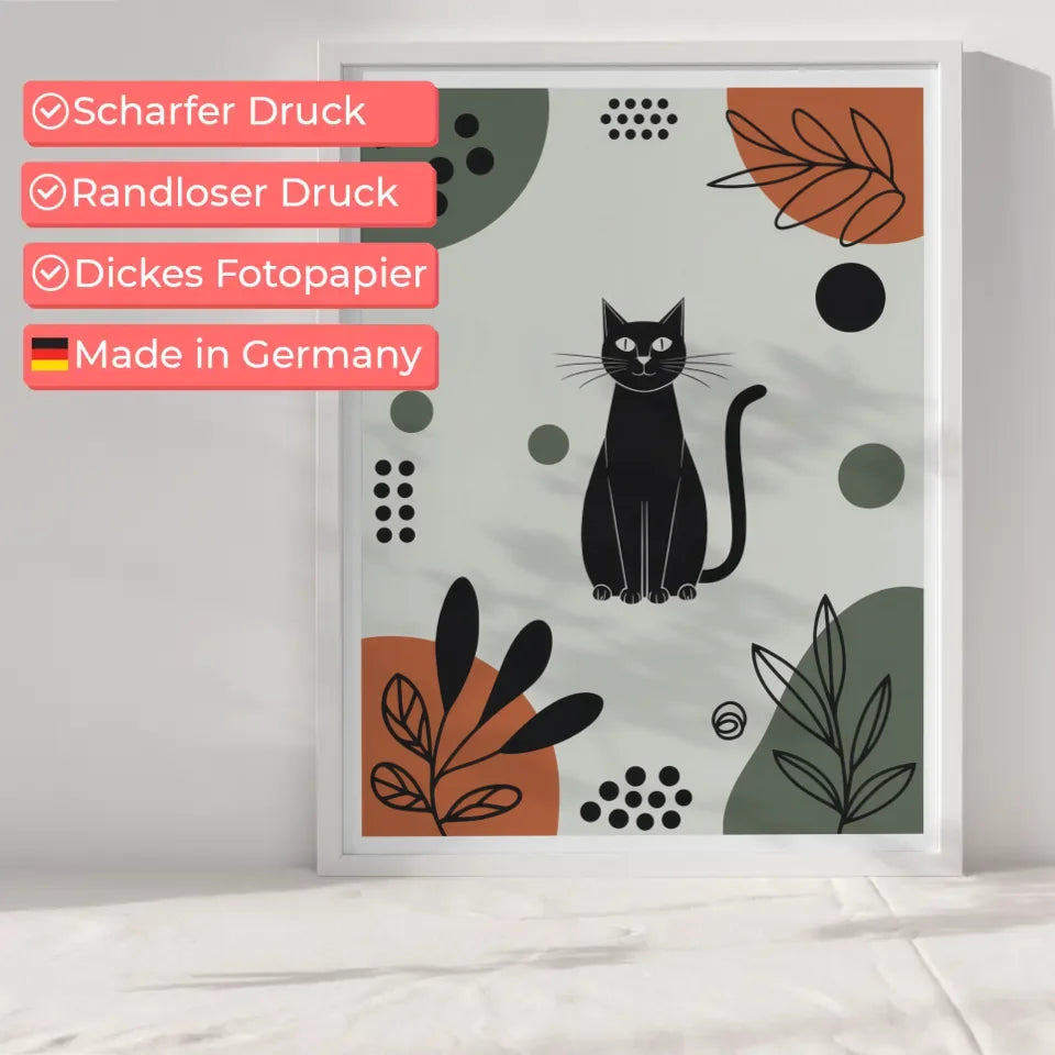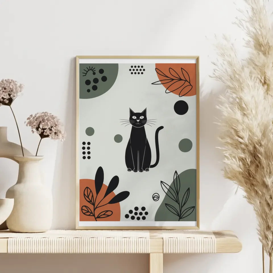 Entdecken Sie unser einzigartiges minimalistisches Poster schwarze Katze in bunten Mustern, das Ihrer Wand einen modernen und künstlerischen Touch verleiht. Dieses stilvolle Poster zeigt eine faszinierende Illustration einer schwarzen Katze, die inmitten einer lebhaften und abstrakten Kulisse sitzt. Die zentrale Position der Katze zieht sofort die Blicke auf sich, während sie von geometrischen Formen wie Kreisen und Rechtecken in leuchtenden Farben umgeben ist. Grüntöne, satte Orangetöne und tiefes Schwarz harmonieren perfekt und schaffen eine ausgewogene Ästhetik, die sowohl beruhigend als auch anregend wirkt.