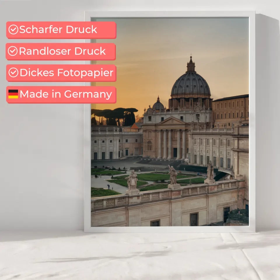 Entdecken Sie unser einzigartiges Poster Vatikanisches Museum bei Goldener Stunde, das die atemberaubende Schönheit des berühmtesten Museums der Welt einfängt. Dieses beeindruckende Panoramafoto zeigt das Vatikanmuseum in der magischen Atmosphäre der goldenen Stunde, wenn das Licht die monumentale Architektur in ein warmes, goldenes Licht taucht. Jedes Detail der Architektur wird auf diesem Poster lebendig, sodass Sie jeden Tag ein Stück der Kunst und Kultur des Vatikan in Ihrem Zuhause erleben können.