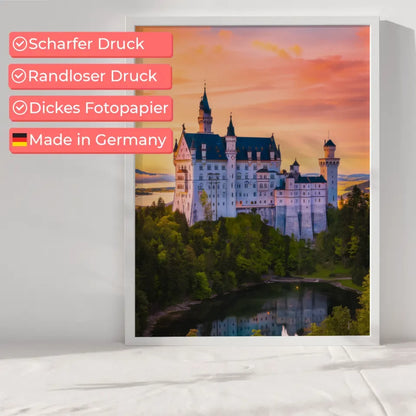 Entdecken Sie unser faszinierendes Schloss Neuschwanstein Poster, das ein atemberaubendes Panoramafoto des weltbekannten Schlosses in Deutschland zur Goldenen Stunde zeigt. Dieses beeindruckende Wandbild bringt die Magie und Schönheit von Neuschwanstein direkt in Ihr Zuhause oder Ihr Büro. Poster sind die perfekte Möglichkeit, Ihre Wände zu verschönern und gleichzeitig ein Stück weit deutsche Kultur zu erleben.