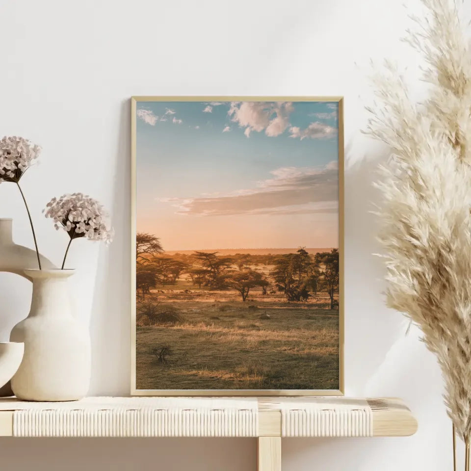 Entdecken Sie das atemberaubende Poster Serengeti Nationalpark Panorama zur Golden Hour, das jeden Raum mit der faszinierenden Schönheit Tansanias bereichert. Dieses eindrucksvolle Panoramafoto zeigt den Serengeti-Nationalpark in den magischen Farben der goldenen Stunde, wenn das Licht sanft ĂŒber die endlosen Savannen strömt und eine einzigartige AtmosphĂ€re schafft.