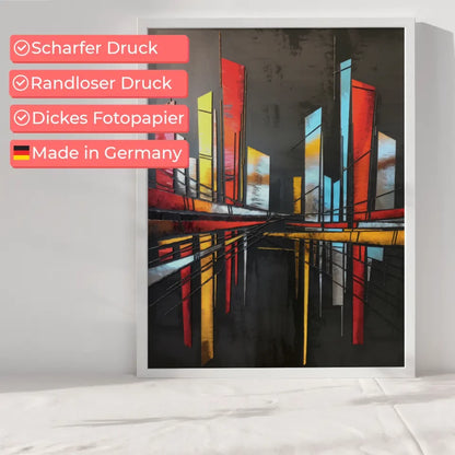 Entdecken Sie unsere einzigartigen modernen Poster, die eine beeindruckende Stadtlandschaft in abstrakter Kunstform präsentieren. Jedes Poster zeigt ein markantes Kunstwerk, das aus geometrischen Formen besteht und die dynamische Energie einer urbanen Umgebung einfängt. Die Verwendung von kräftigen Rottönen, leuchtenden Blautönen und strahlenden Gelbtönen sorgt für eine lebendige Darstellung von Wolkenkratzern, Brücken und Straßen.