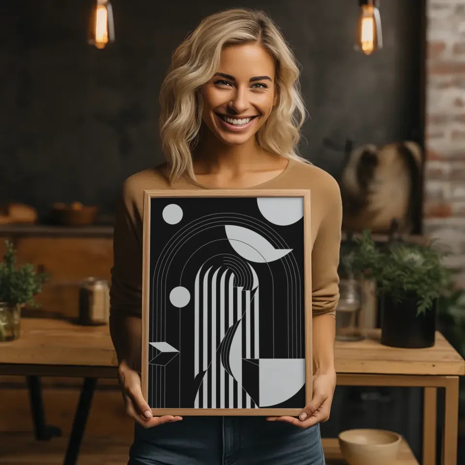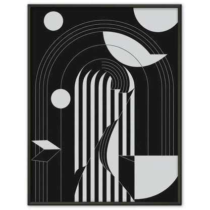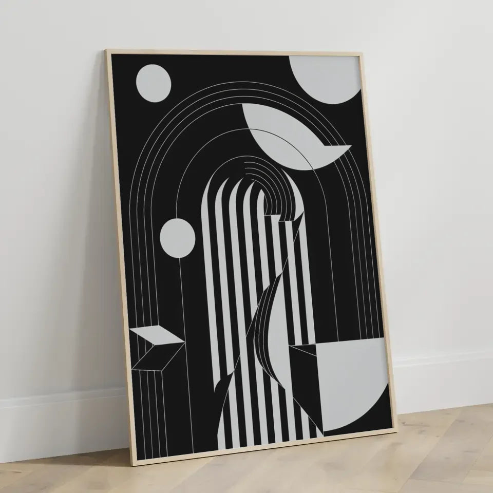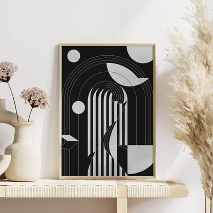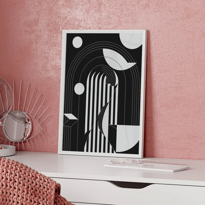 Entdecken Sie unser modernes Poster mit abstrakter geometrischer Illustration, das perfekt in zeitgenössische Wohnräume passt. Dieses eindrucksvolle Wandbild präsentiert ein überwiegend schwarz-weißes Farbschema, das Eleganz und Stil ausstrahlt. Die geschwungenen Linien und geometrischen Formen, darunter Kreise und Dreiecke, schaffen eine faszinierende Komposition, die jede Wand zum Leben erweckt.