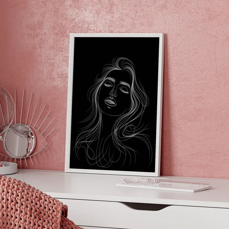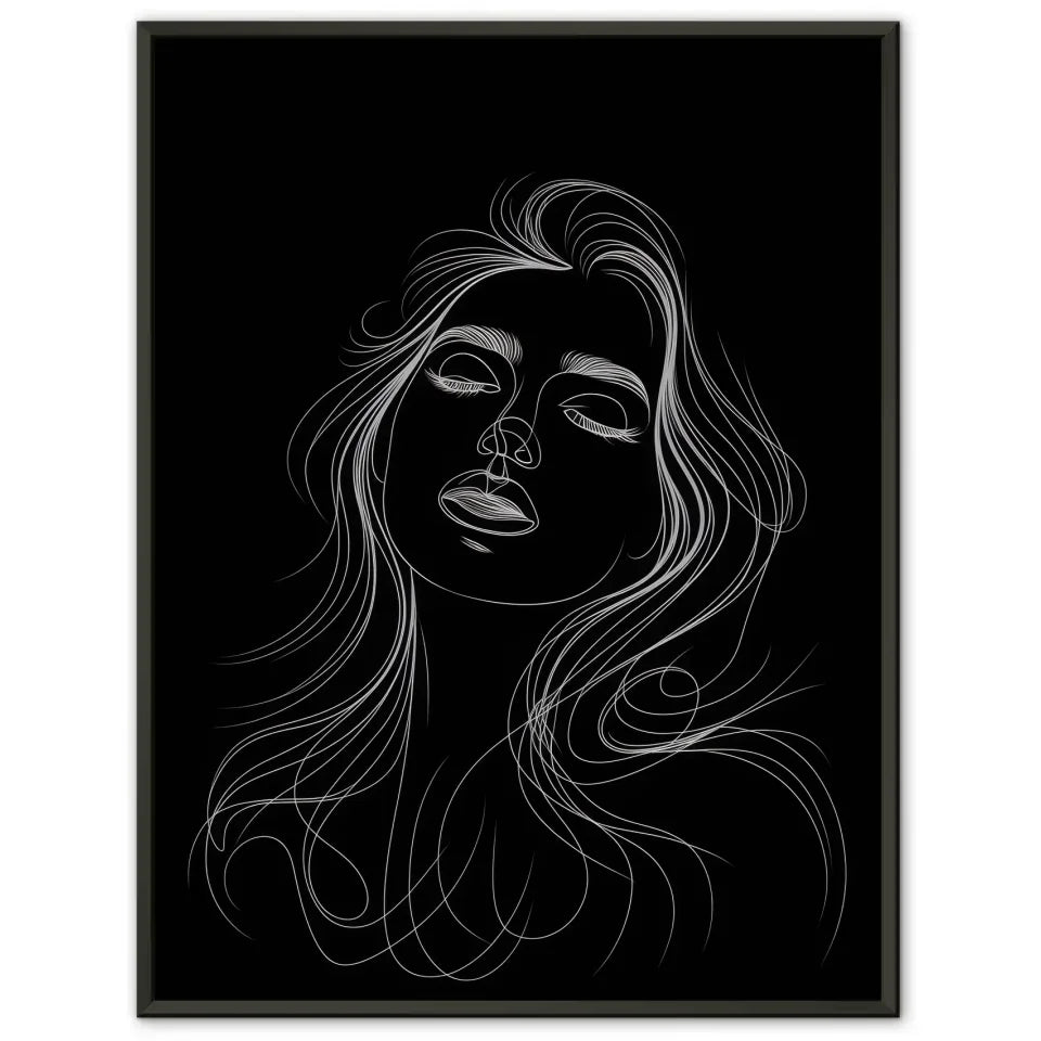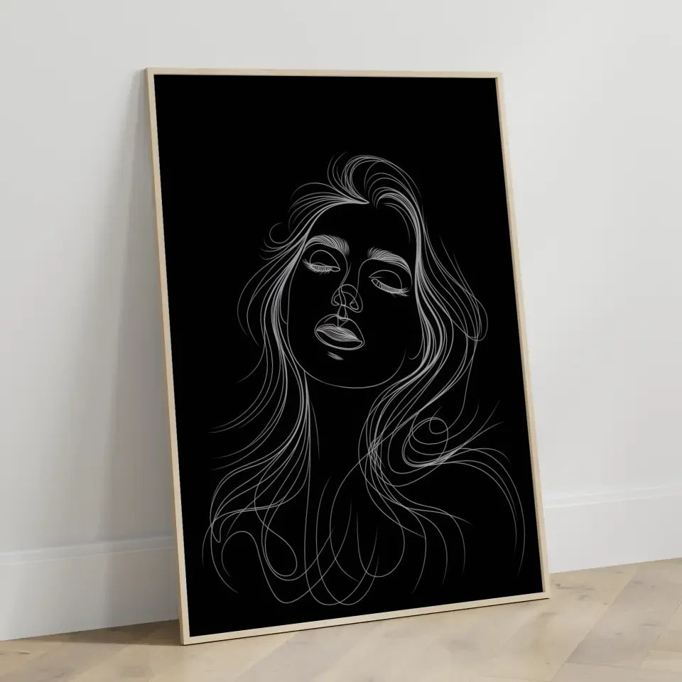 Entdecken Sie unser einzigartiges Monochrome Frauengesicht Poster Kunstwerk, das minimalistisches Design und künstlerische Eleganz vereint. Dieses Poster zeigt die faszinierende Darstellung eines entspannten Gesichts einer Frau, das durch komplizierte weiße Linien auf einem tiefschwarzen Hintergrund zum Leben erweckt wird. Der beeindruckende Kontrast zwischen Schwarz und Weiß schafft eine sofortige visuelle Anziehungskraft, die jede Wand zum Strahlen bringt.