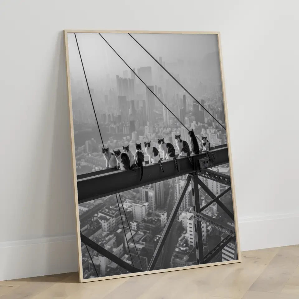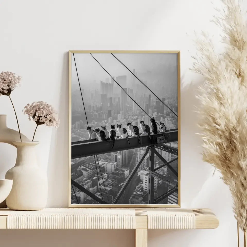 Entdecken Sie unser einzigartiges monochromes Poster Katzenarbeiter auf Stahlträger über der Stadt, das Ihrer Wand einen Hauch von urbanem Flair verleiht. Dieses beeindruckende Kunstwerk zeigt eine Gruppe von Katzen, die als Bauarbeiter hoch über einer pulsierenden Stadtlandschaft auf einem Stahlträger sitzen. Perfekt für Katzenliebhaber und Menschen mit einem Sinn für besondere Dekoration, ist dieses Poster ein Muss für jede Wohnung. Die detailreiche Darstellung der Katzen, die eine Pause von ihren Pflichten machen, vermittelt sowohl ein Gefühl von Gefahr als auch von Kameradschaft. Die dunstige Atmosphäre der Stadt unter ihnen verstärkt die Faszination und das Abenteuer, das dieses Wandbild ausstrahlt. Egal, ob Sie es in Ihrem Wohnzimmer, Büro oder als Teil einer Galerie-Wand präsentieren, das monochrome Design bringt Eleganz und Stil in jeden Raum. Lassen Sie sich von diesem Poster inspirieren und schaffen Sie ein einmaliges Ambiente in Ihrer Umgebung. Bestellen Sie jetzt und verwandeln Sie Ihre Wände mit diesem einzigartigen Katzenbild!
