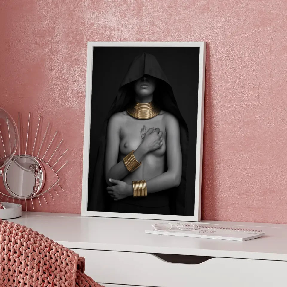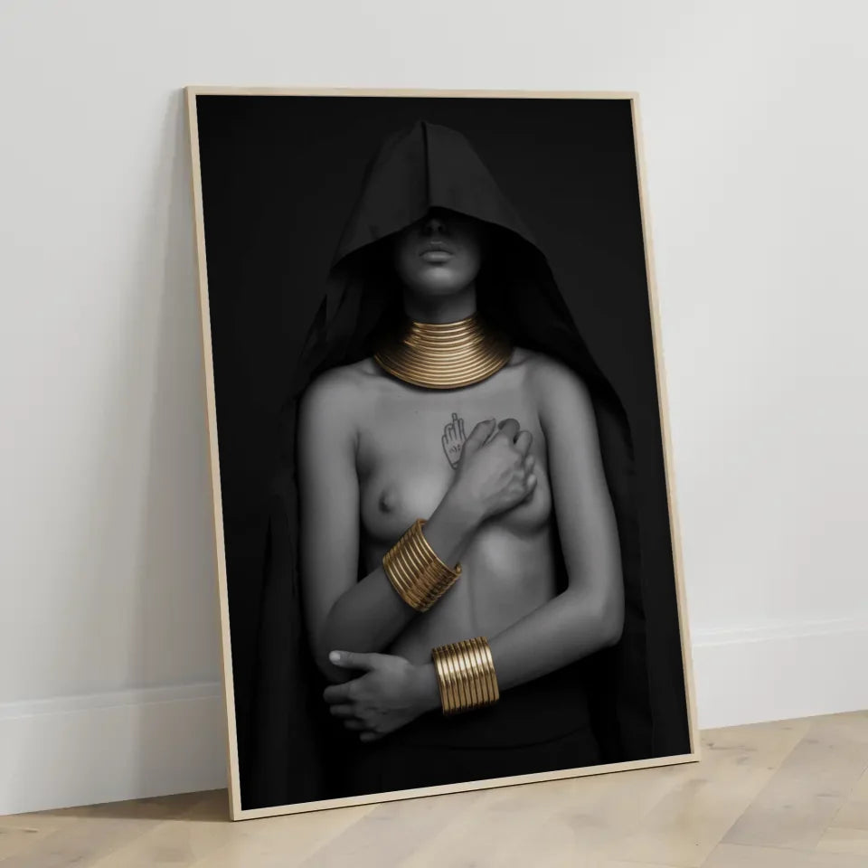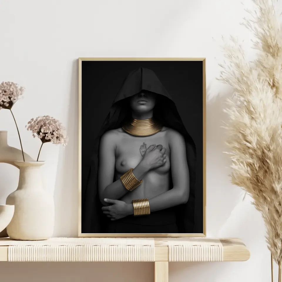 Das Augenmerk wird sofort auf die goldene, halsbandartige Halskette gelenkt, die ihren Hals fest umschlieĂt. Die Kombination aus Nacktheit und der kunstvollen TĂ€towierung einer Handbewegung auf dem Oberkörper dieser Frau vermittelt eine starke Aussage und zieht Betrachter in ihren Bann. Die goldenen Armreifen an ihren Handgelenken setzen zusĂ€tzliche Akzente und verleihen dem Bild eine luxuriöse Note.