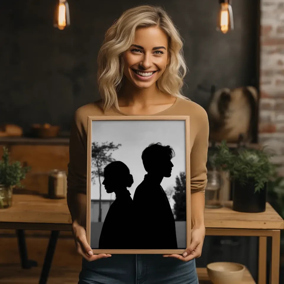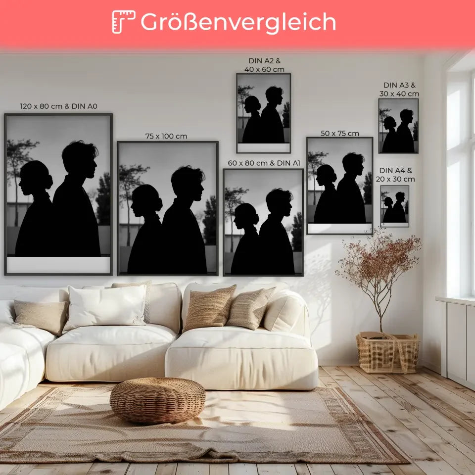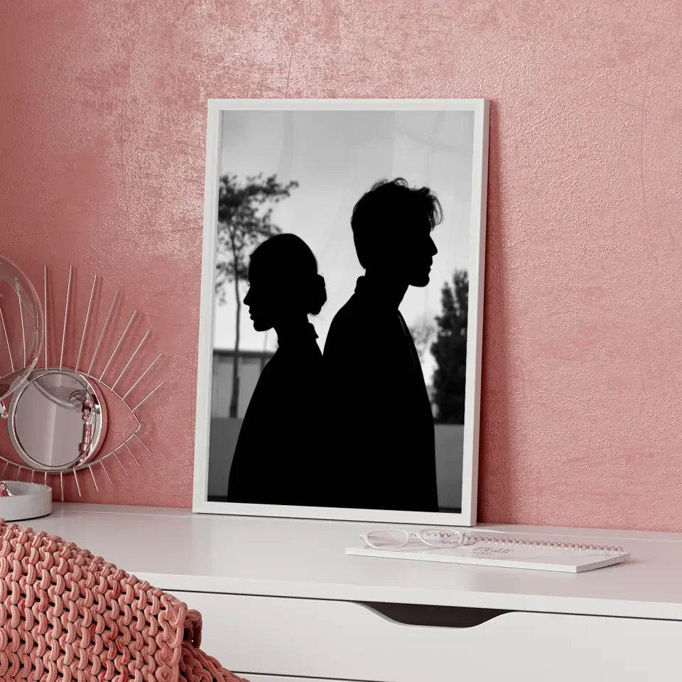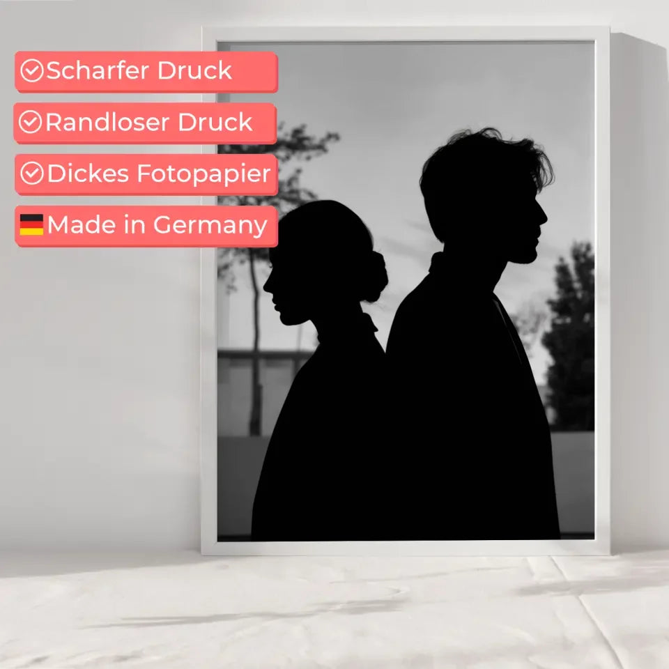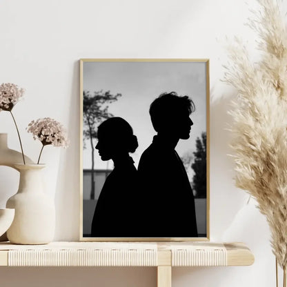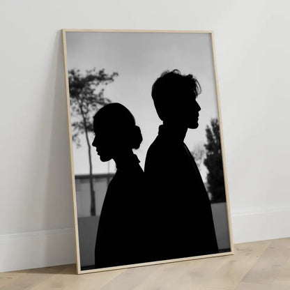 Entdecken Sie unser einzigartiges monochromes Poster zweier Silhouetten, das nicht nur Ihre Wände verschönert, sondern auch eine nachdenkliche Atmosphäre in jeden Raum bringt. Dieses stilvolle Poster zeigt einen Mann und eine Frau, die nebeneinanderstehen, wobei die Frau nach links und der Mann nach rechts blickt. Die Details, wie die ordentlich zusammengebundenen Haare der Frau und das leicht zerzauste Aussehen des Mannes, verleihen dem Bild Tiefe und Charakter. Der minimalistische Hintergrund mit dezenten Bäumen und einem Gebäude sorgt für einen harmonischen Look, der perfekt in moderne Wohnkonzepte integriert werden kann. Unsere Modellbilder sind speziell dafür entworfen, Emotionen zu wecken und zum Nachdenken anzuregen. Holen Sie sich das Monochrome Poster in Ihr Zuhause und genießen Sie die gelassene Stimmung, die es verbreitet. Ob im Wohnzimmer, Schlafzimmer oder Flur – dieses Poster wird zum echten Blickfang und verleiht Ihrem Raum einen Hauch von Eleganz.