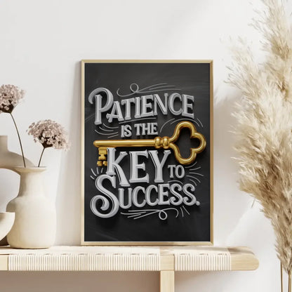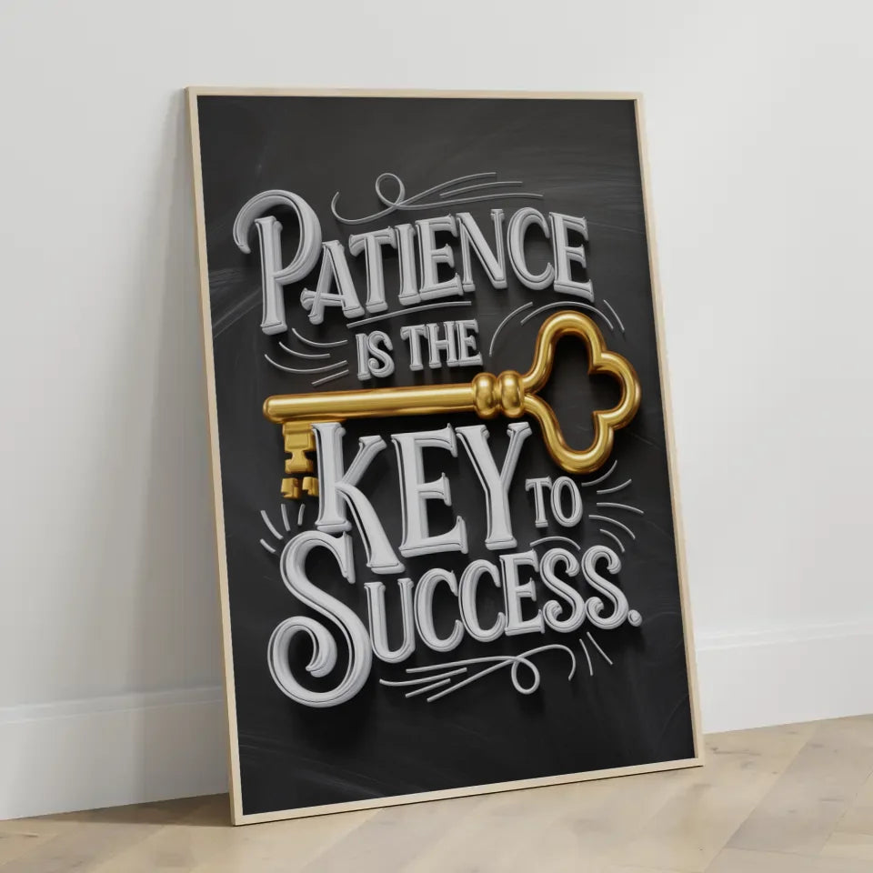 Im Zentrum des Motivationsposters befindet sich ein großer, goldener Schlüssel, der symbolisch für die Erschließung des Erfolgs steht. Dieses Bild spricht nicht nur die Augen an, sondern regt auch zum Nachdenken an und erinnert jeden Betrachter daran, dass Geduld eine wichtige Tugend auf dem Weg zum Erfolg ist. Ideal für Büros, Wohnräume oder als Geschenk für Freunde und Familie, die Motivation benötigen. Verwenden Sie unser Poster, um positive Energie und Inspiration in Ihre Umgebung zu bringen.