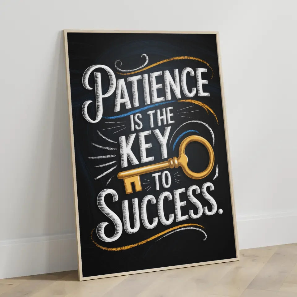 Die zentrale grafische Darstellung eines großen, goldenen Schlüssels betont die wichtige Rolle von Geduld auf dem Weg zum Erfolg. Umgeben von wirbelnden Linien und kunstvollen Elementen zeigt sich das Können des Künstlers und macht dieses Poster zu einem wahren Blickfang. Es eignet sich hervorragend als Wanddekoration sowohl für das Zuhause als auch für das Büro.