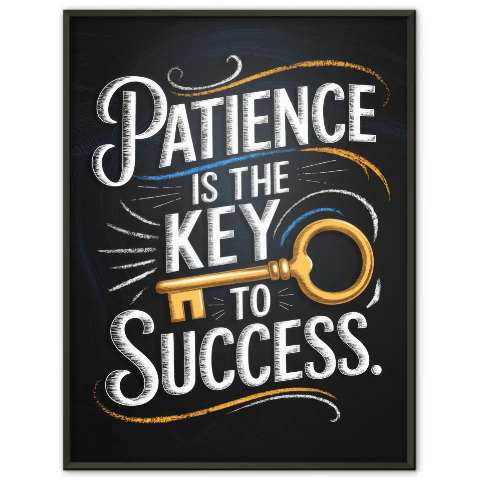 Verleihen Sie Ihrem Raum mit unserem Motivationsposter neuen Schwung! Es ist nicht nur ein Kunstwerk, sondern auch eine ständige Erinnerung daran, dass Geduld der Schlüssel zu Ihren Zielen ist. Bestellen Sie jetzt Ihr persönliches Poster und lassen Sie sich täglich von dieser inspirierenden Botschaft motivieren!