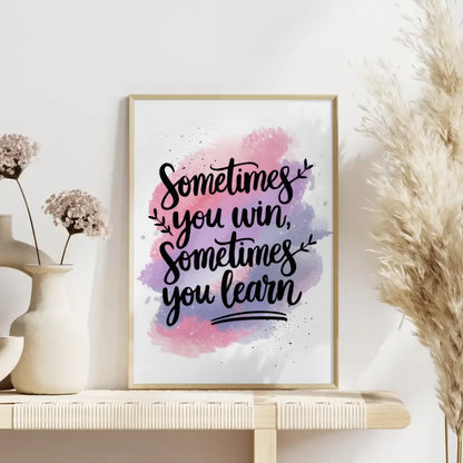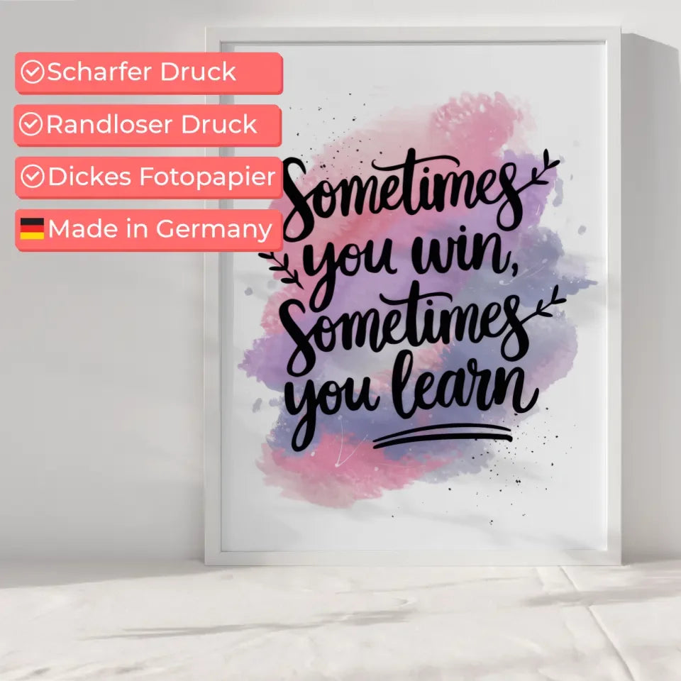 Verleihen Sie Ihren Wänden eine besondere Note mit unserem einzigartigen Motivationsposter, das inspirierende Worte in ein ansprechendes Design integriert. Dieses Spruchbild, das ein handgeschriebenes Zitat 'Manchmal gewinnt man, manchmal lernt man“ zeigt, ist perfekt, um positive Energie in jeden Raum zu bringen. Das Poster ist auf einem sanften Aquarellhintergrund in harmonischen Rosa-, Lila- und Blautönen gestaltet und sorgt damit für eine beruhigende Atmosphäre.