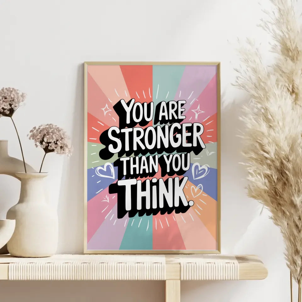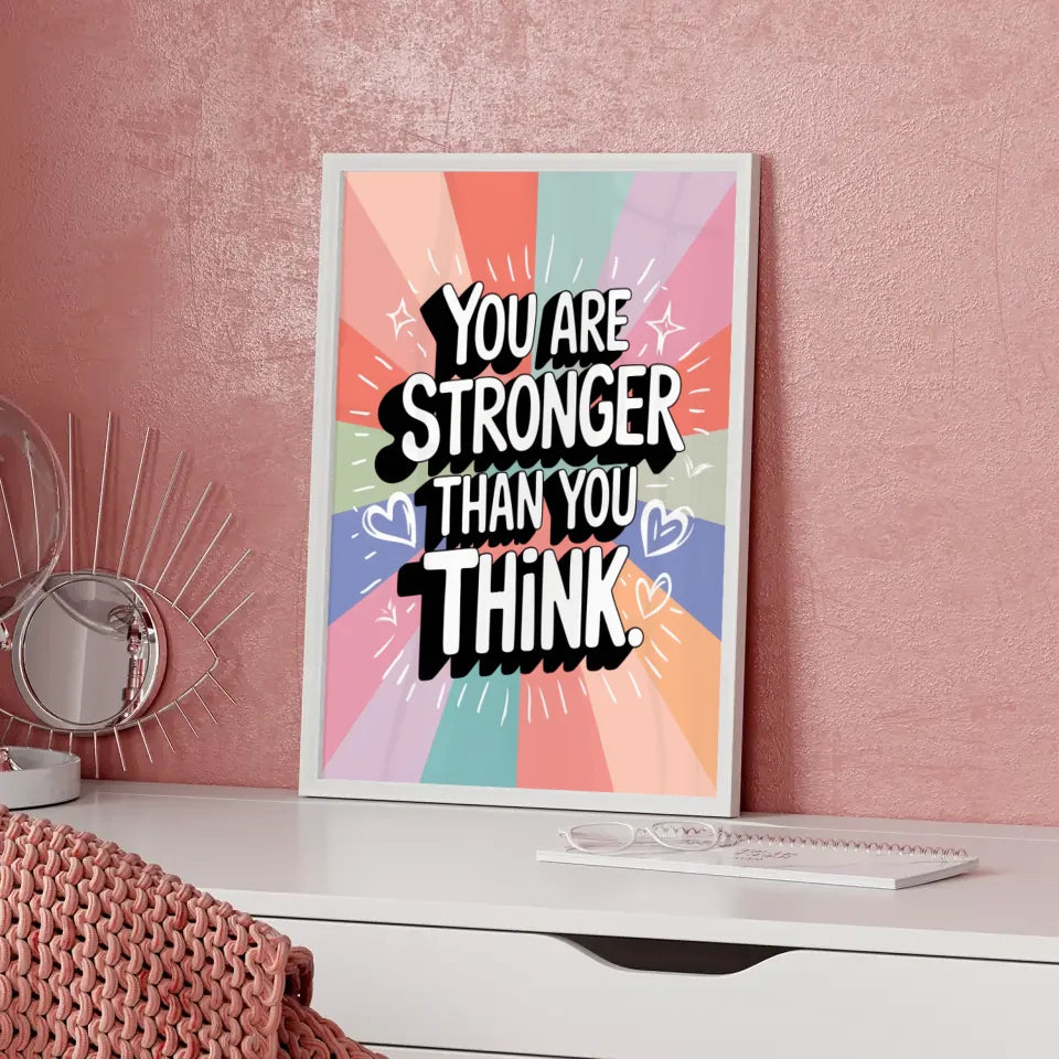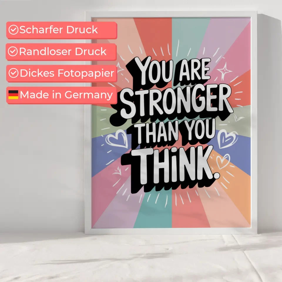 Entdecken Sie unser einzigartiges motivierendes Poster mit elegantem Zitat in Pastellfarben gestalten, das sich perfekt für Ihr Zuhause oder Büro eignet. Dieses bezaubernde Spruchbild zeigt einen sanften Pastellverlauf in Hellrosa, Babyblau, Lavendel, Mintgrün und Pfirsich, der eine harmonische Atmosphäre schafft. Mit dem kraftvollen Zitat 'Du bist stärker als du denkst.“ in einer stilvollen, eleganten Schriftart wird dieses Poster zum idealen Motivationsschub im Alltag.